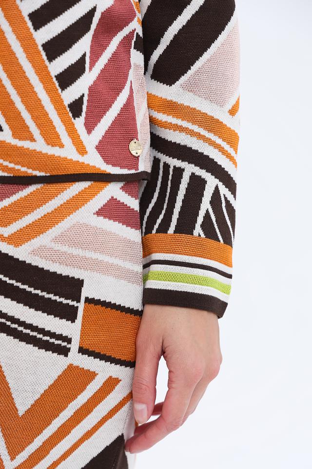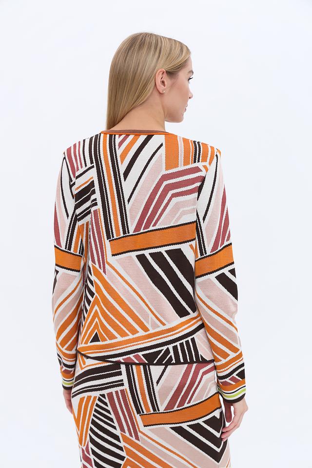 Этот стильный пуловер от Marc Cain станет ярким акцентом вашего образа. Модель выполнена в оригинальном дизайне с геометрическим принтом, сочетающим в себе оранжевые, коричневые и бежевые оттенки.