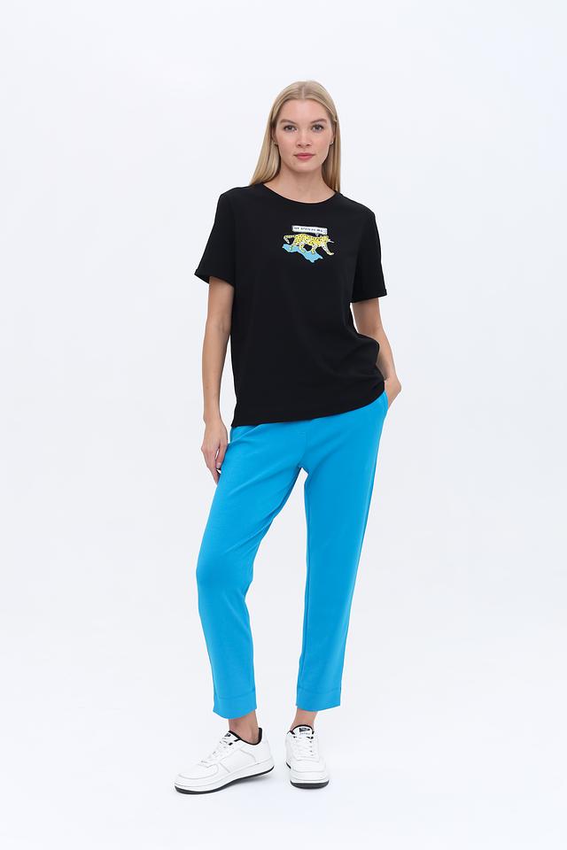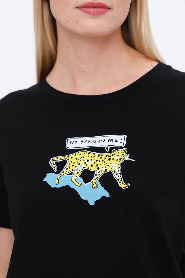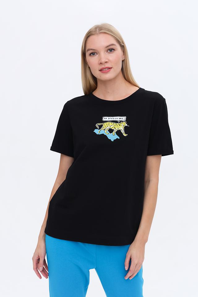 Главная особенность этой модели – яркий и оригинальный принт гепарда с забавной надписью. Этот принт добавляет футболке индивидуальности и делает ее отличным акцентом в вашем гардеробе. Футболка идеально сочетается с джинсами, шортами или юбками.