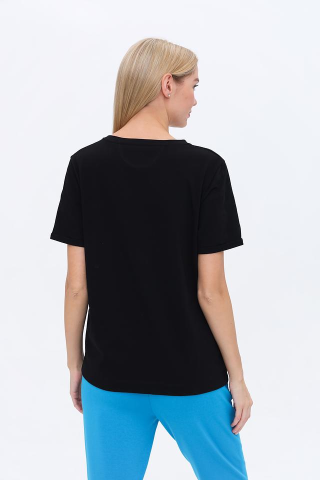 Футболка имеет классический прямой крой, который подходит для любой фигуры. Короткие рукава и круглый вырез горловины делают ее универсальной для различных образов.