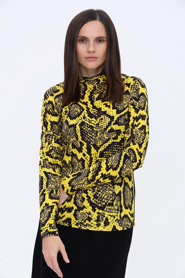 Эта стильная водолазка от Marc Cain выполнена в эффектном дизайне с принтом, имитирующим змеиную кожу. Основной цвет изделия – жёлтый, дополненный чёрными элементами рисунка.
