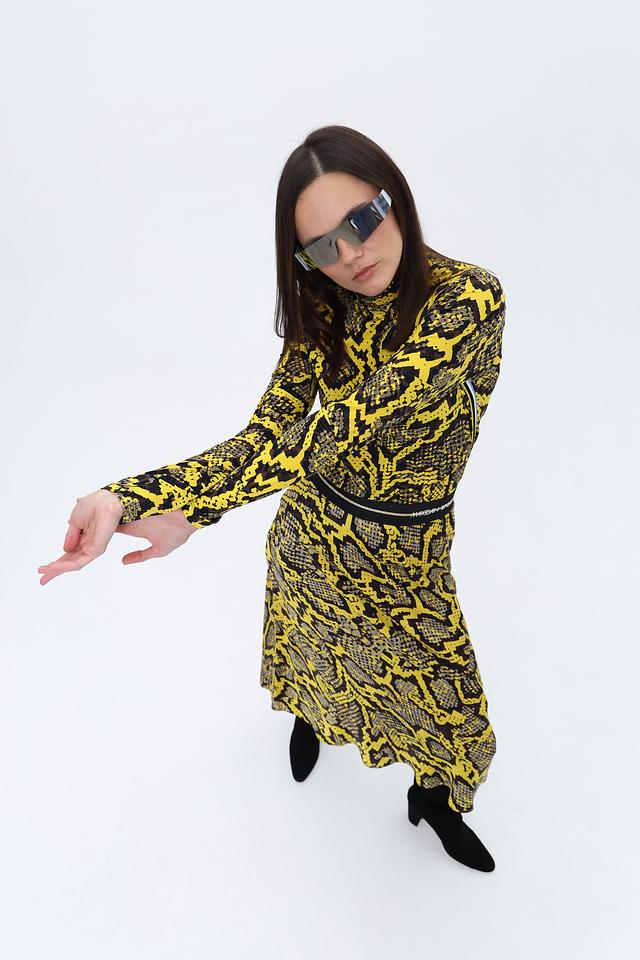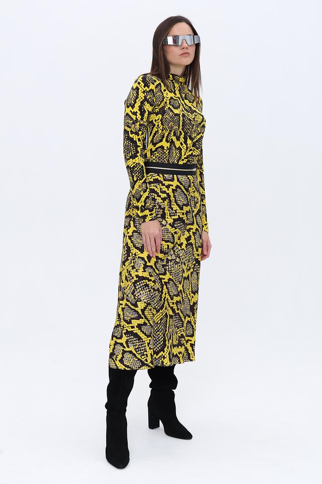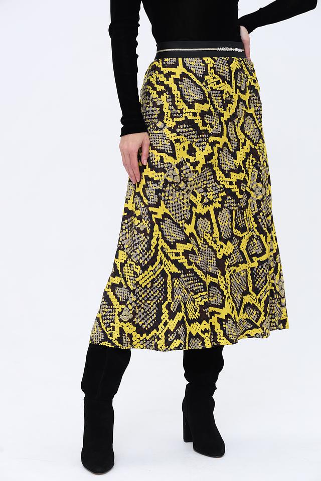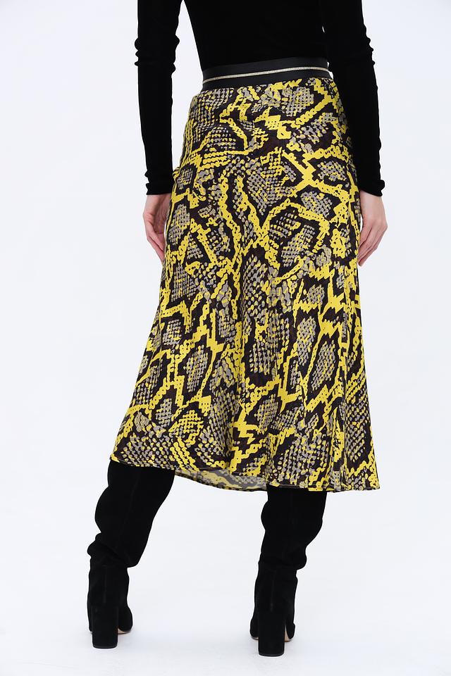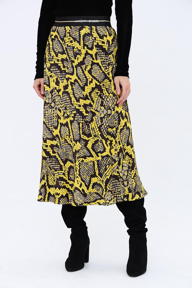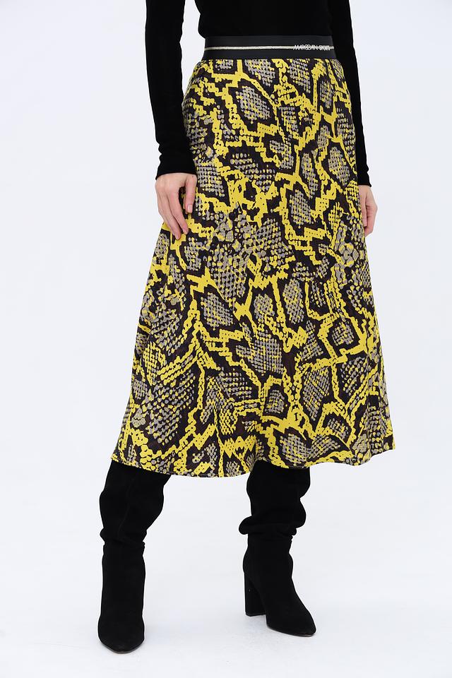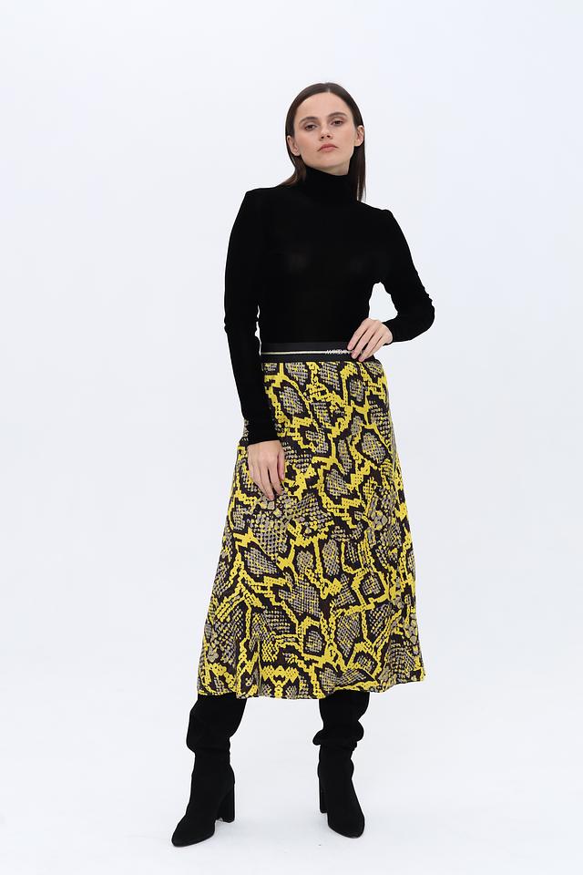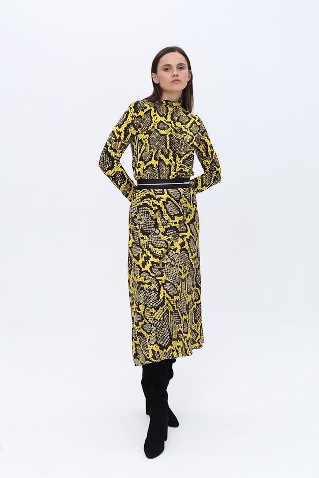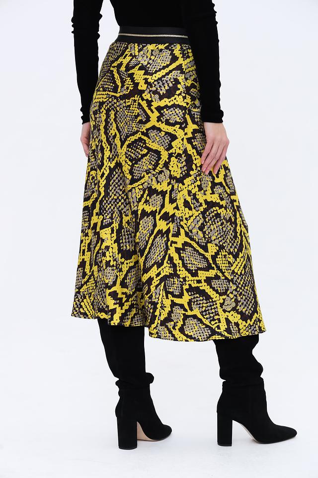 Юбка имеет длину миди и облегающий силуэт, подчеркивающий фигуру. Главная особенность – эффектный принт, имитирующий кожу рептилии в сочетании жёлтого и чёрного цветов. Эластичный пояс обеспечивает удобную посадку.