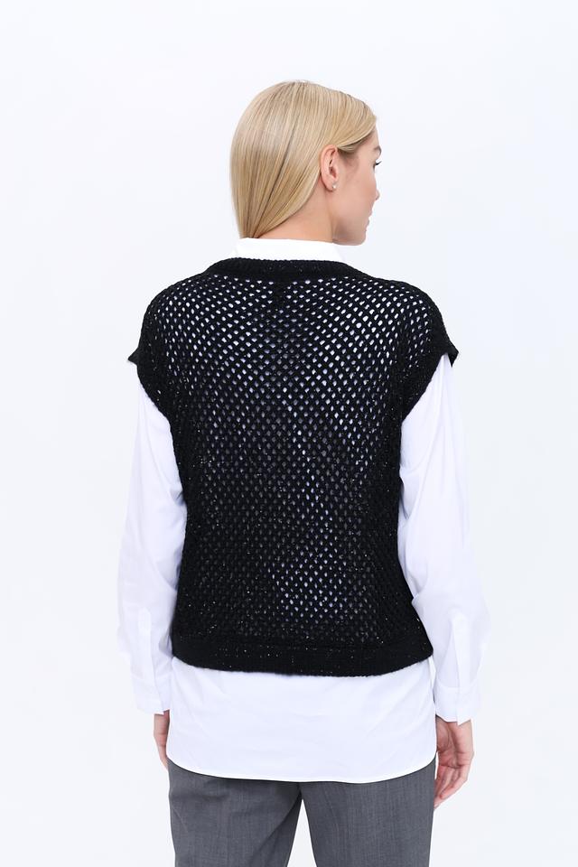 Жилет имеет свободный крой, который обеспечивает комфорт в носке. Ажурная вязка придает изделию легкость и воздушность, делая его отличным вариантом для теплого времени года или для ношения поверх рубашки или блузки.