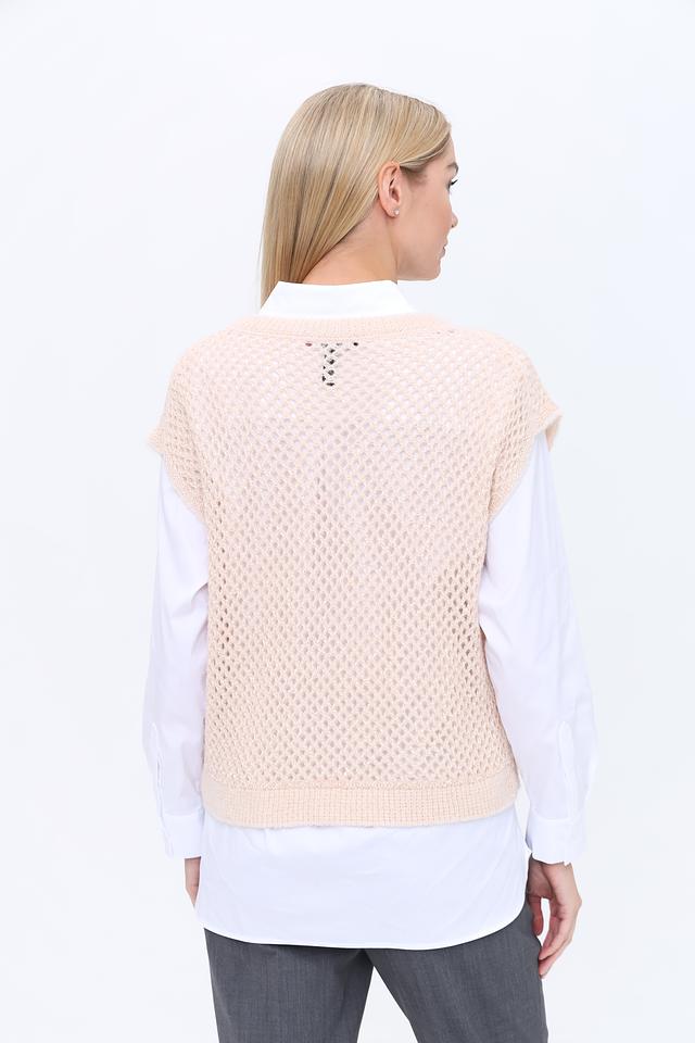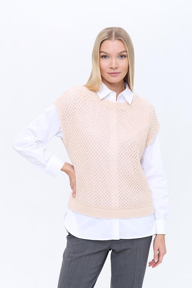 Персиковый вязаный жилет Marc Cain из тонкой пряжи с ажурным узором. Модель свободного кроя без рукавов станет стильным дополнением к вашему образу и подчеркнет индивидуальность. Состав: полиамид 75%, акрил 11%, альпака 9%, шерсть 5%