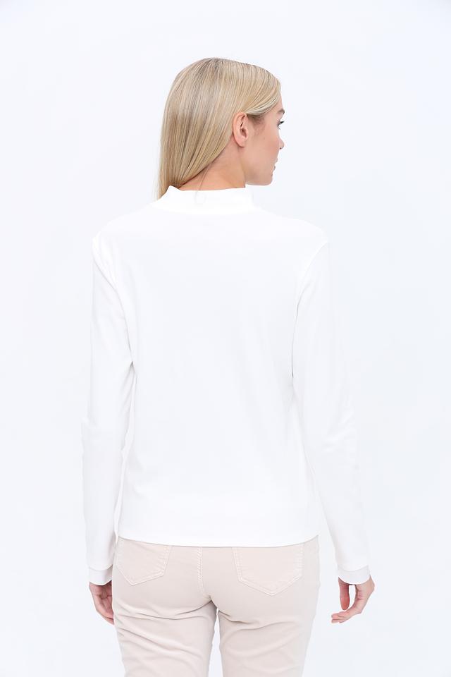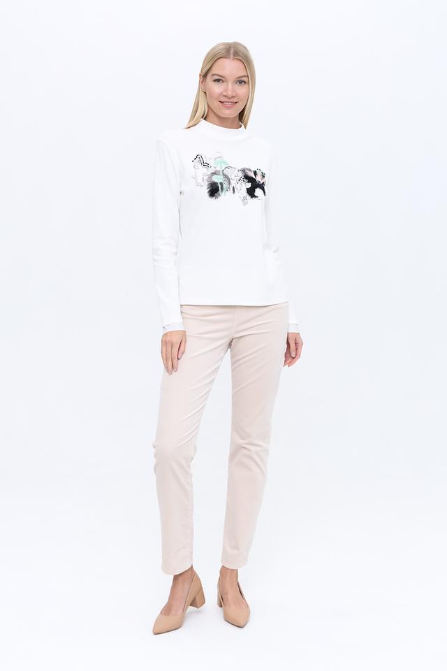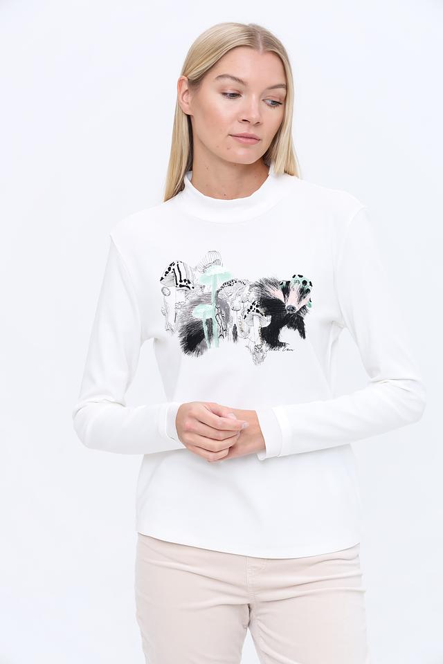 Белый лонгслив Marc Cain с оригинальным принтом на лицевой стороне. Изготовлен из 100% хлопка, обеспечивающего комфорт и воздухопроницаемость. Идеально подходит для создания стильного повседневного образа. Состав: хлопок 100%
