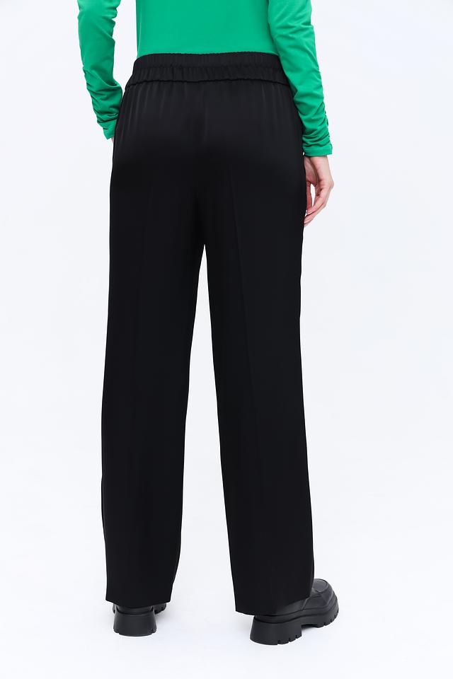 Брюки имеют прямой крой, который визуально вытягивает силуэт и обеспечивает комфорт при носке. Пояс на завязках позволяет регулировать посадку по фигуре, подчеркивая талию.