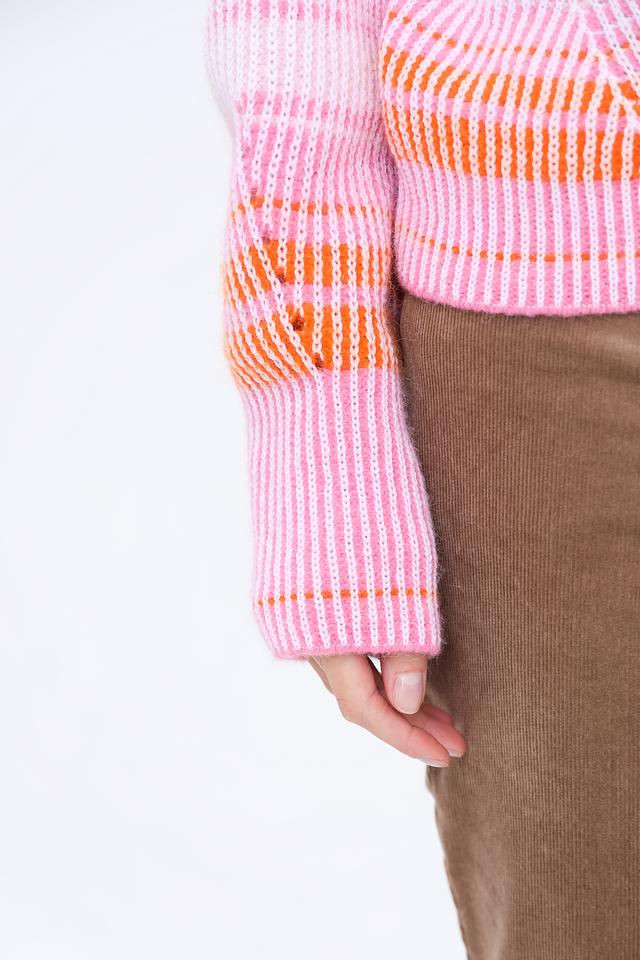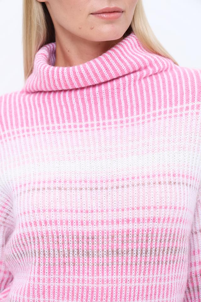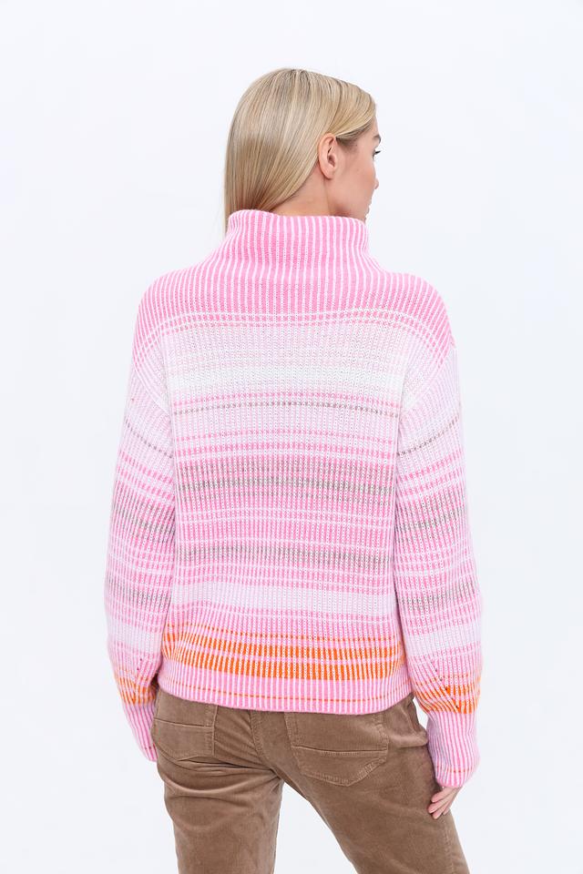 Этот пуловер от Marc Cain выполнен в нежном розовом цвете с ярким полосатым узором. Высокий воротник добавляет элегантности и защищает от холода.