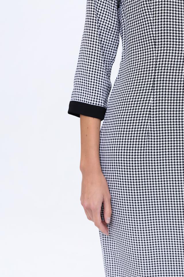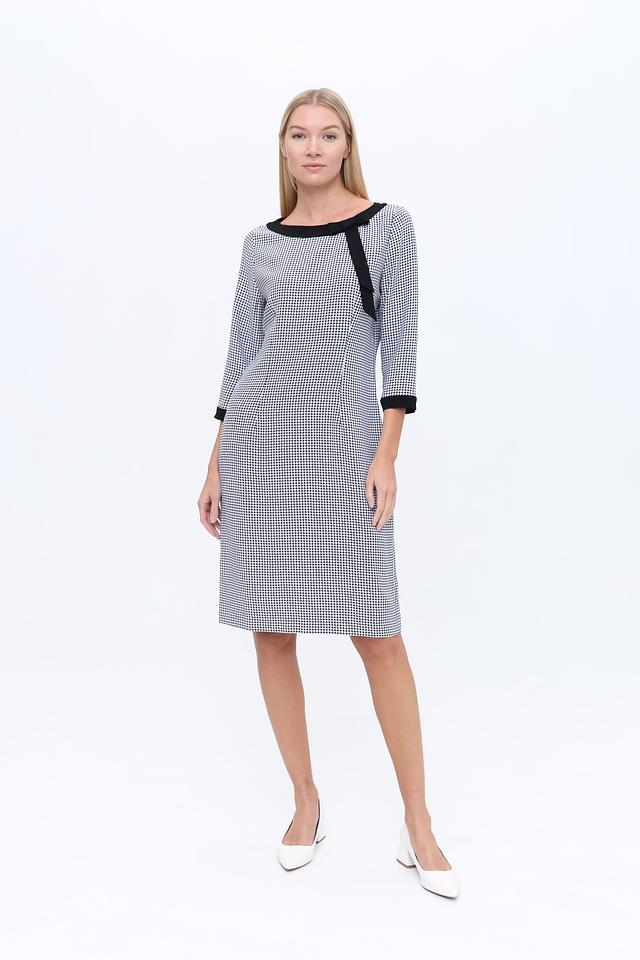 Основной цвет платья – белый, с контрастным черным рисунком в виде клетки "гусиная лапка". Черный цвет также присутствует в отделке горловины и манжетах рукавов, а также в оформлении декоративного банта. Приталенный силуэт подчеркивает фигуру, а длина миди делает платье универсальным для различных случаев.
