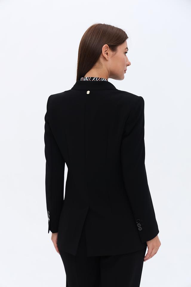 Жакет выполнен из высококачественного триацетата с добавлением полиэстера, что обеспечивает ему приятную текстуру, хорошую форму и долговечность. Прямой крой жакета позволяет создать женственный силуэт, а удобная длина делает его практичным для повседневной носки.