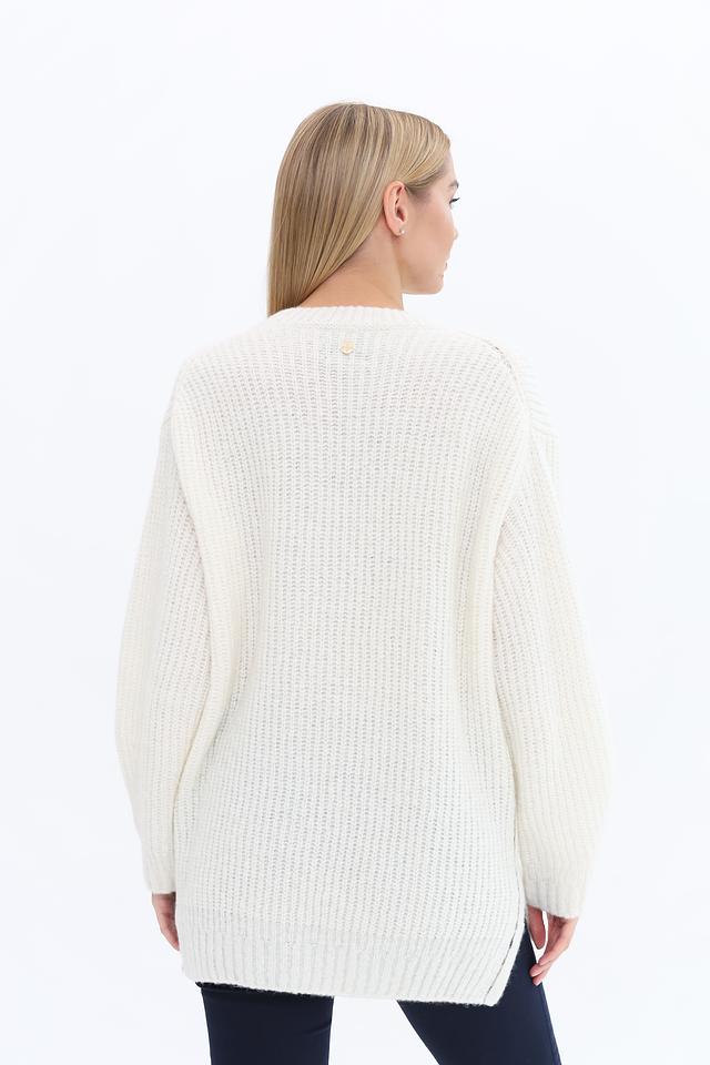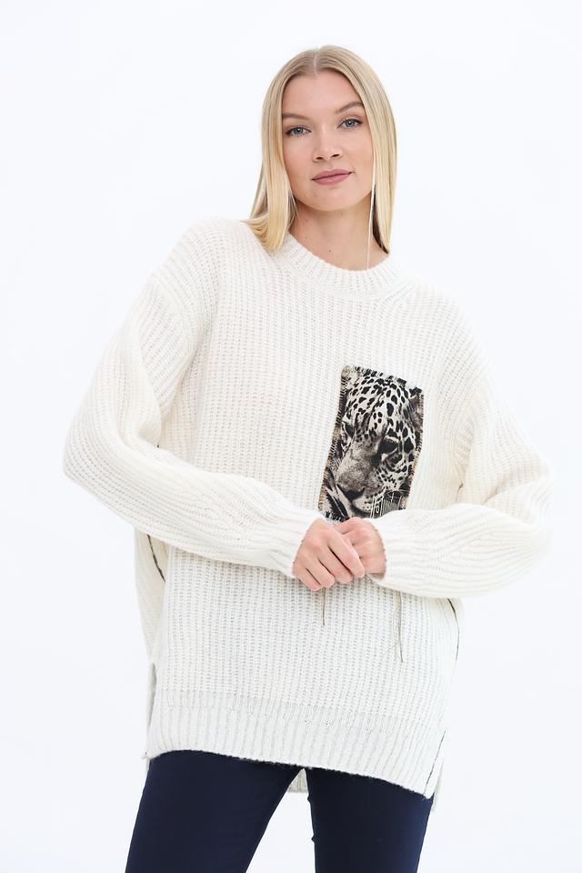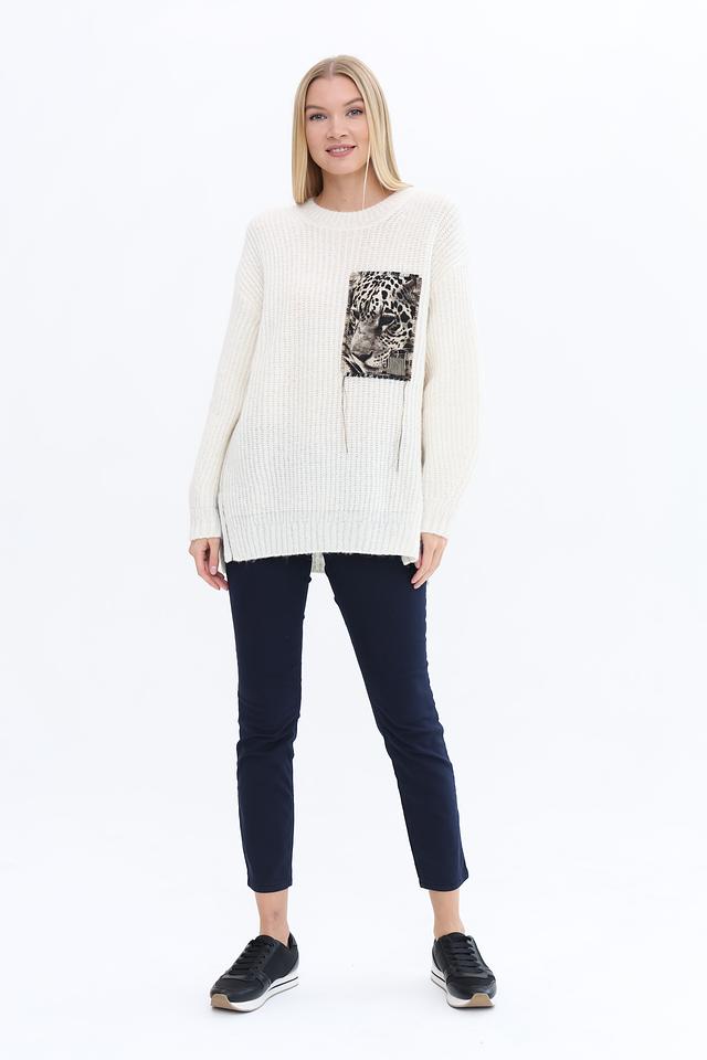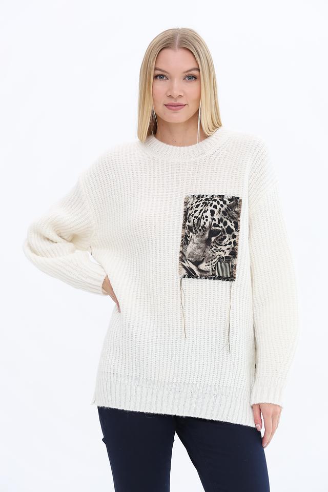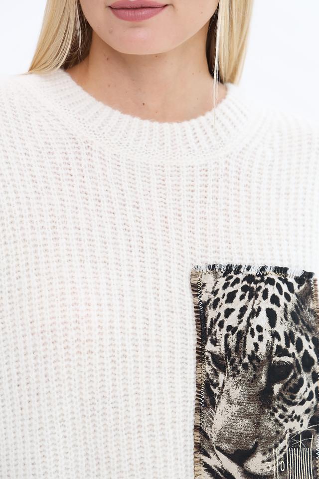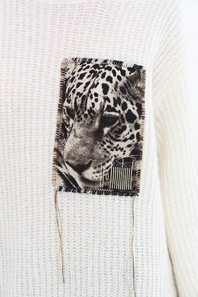 Пуловер имеет кремовый цвет и украшен эффектным принтом с изображением леопарда, который придает ему уникальный и запоминающийся вид. Свободный крой обеспечивает свободу движений, а округлый вырез горловины делает его универсальным для различных стилей.