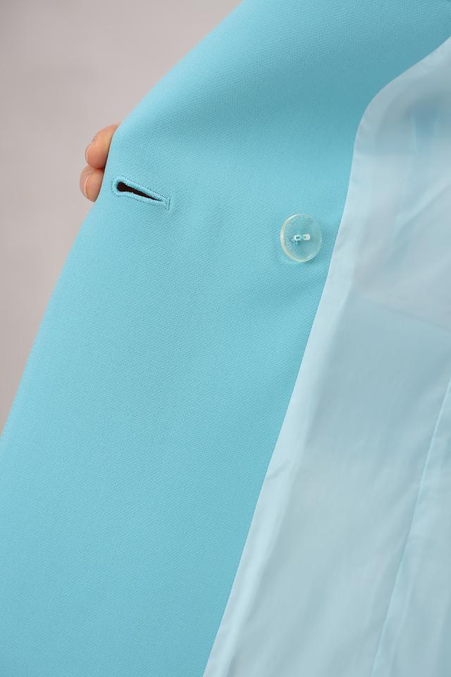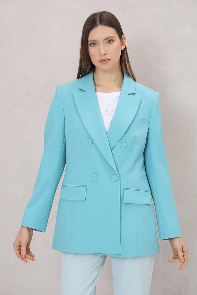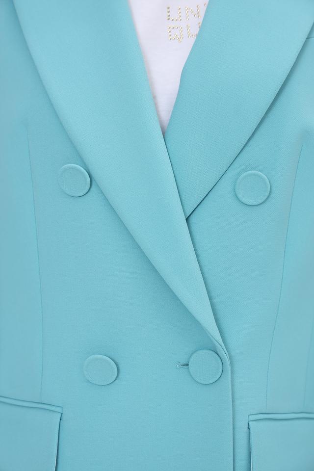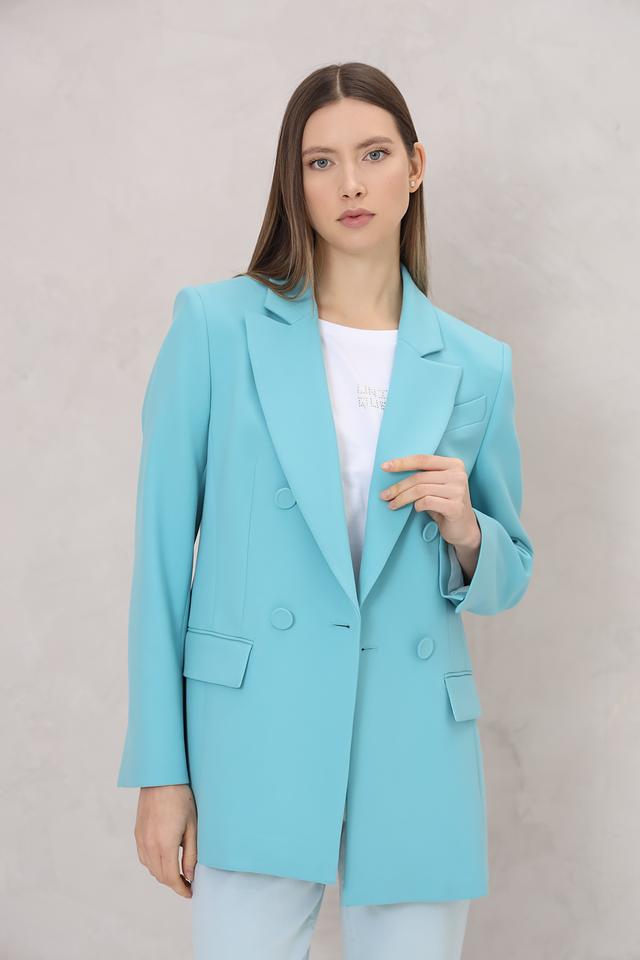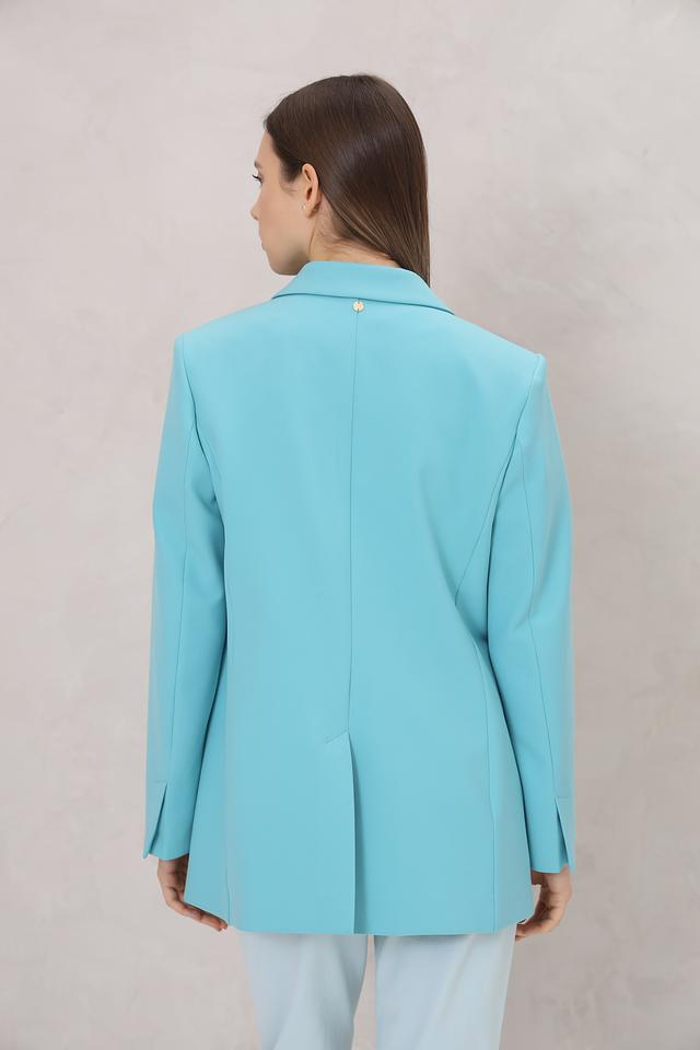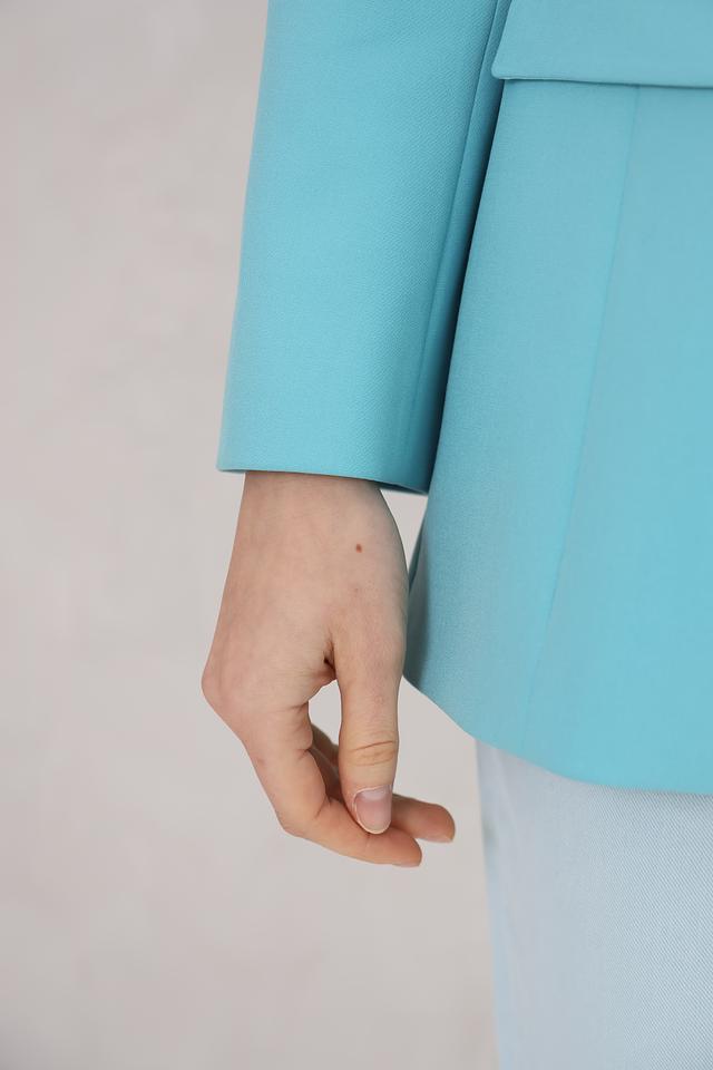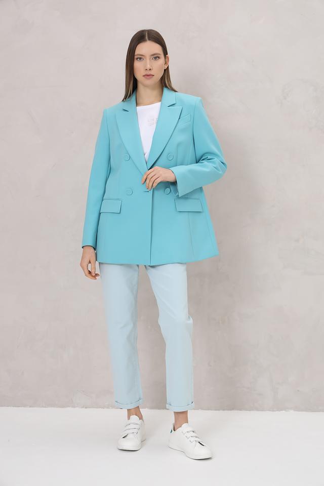 Этот жакет от Marc Cain выполнен в ярком бирюзовом цвете и станет отличным дополнением к вашему гардеробу. Модель имеет классический крой, двубортную застёжку на пуговицы в тон ткани и лацканы.