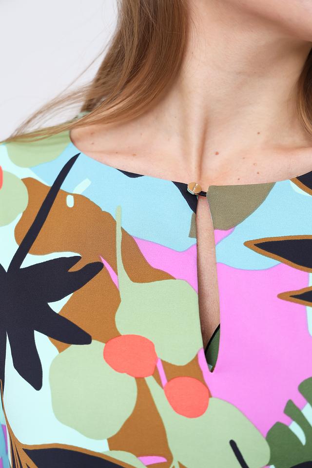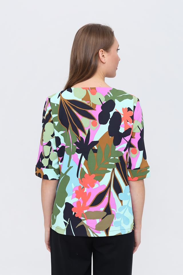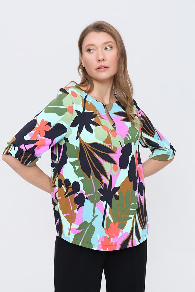 Блуза имеет свободный крой, короткие рукава и округлый вырез горловины с небольшой декоративной V-образной вставкой. Главная особенность этой модели – эффектный цветочный принт, выполненный в разнообразных оттенках: от нежно-розового и лайма до насыщенного коричневого и тёмно-зелёного.
