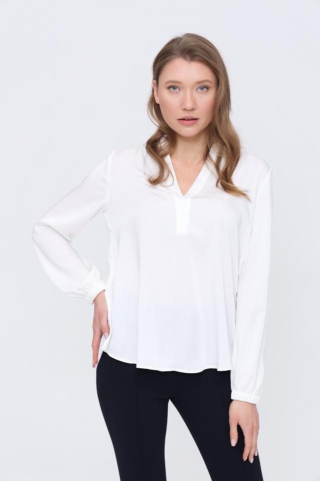 Модель имеет V-образный вырез, который визуально удлиняет шею и придает образу женственность. Длинные рукава с манжетами и небольшими складками добавляют изысканности. Свободный крой обеспечивает комфорт при носке и позволяет создать расслабленный, но стильный образ.