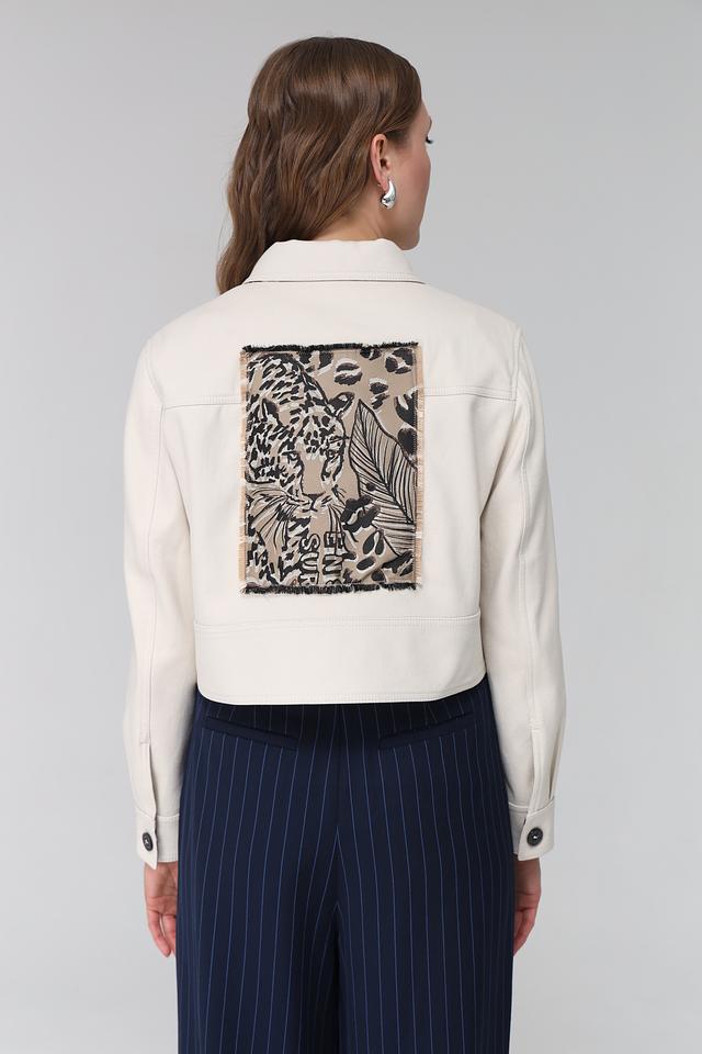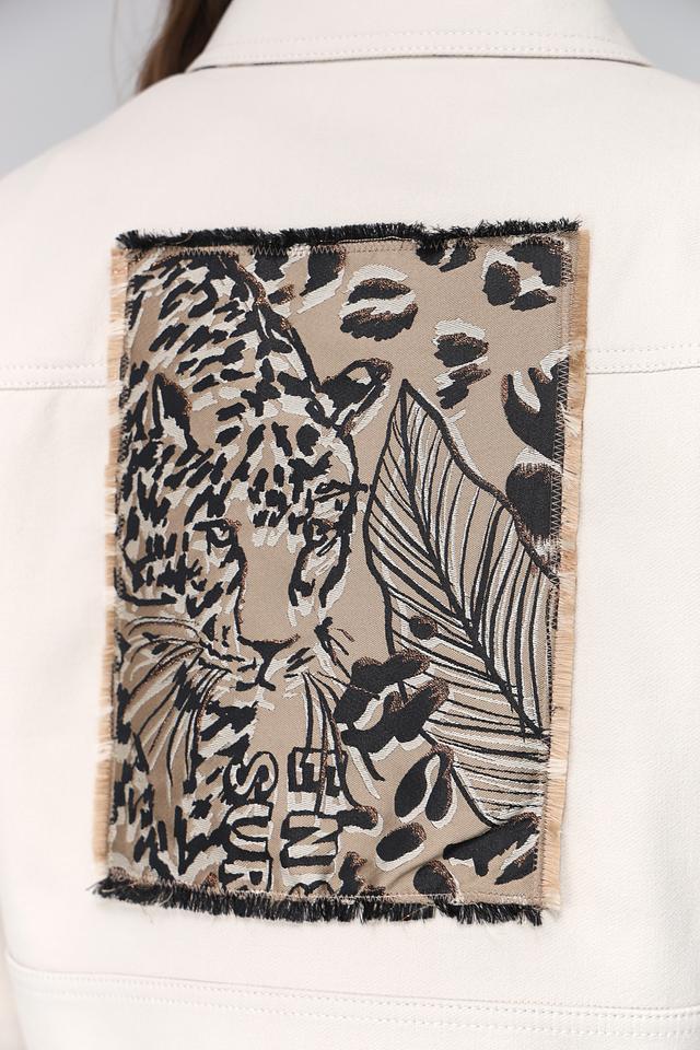 Особенностью данной модели является яркий принт с изображением леопарда и растительными мотивами на спине, который добавляет образу индивидуальности. Жакет идеально сочетается с брюками, юбками и джинсами, создавая стильные и разнообразные образы.