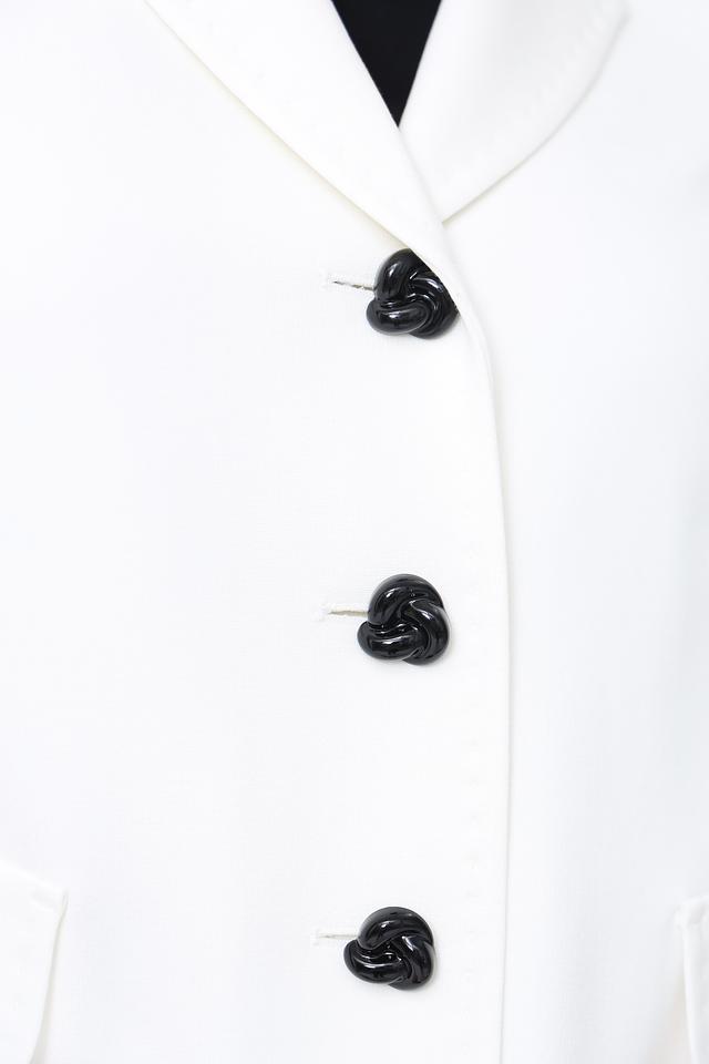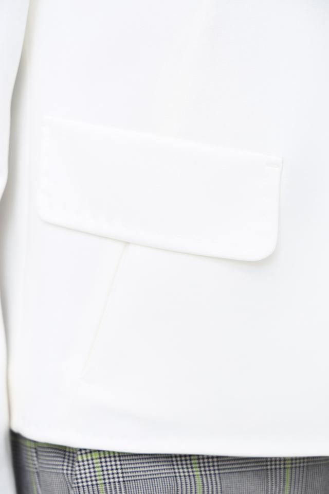 Жакет имеет прямой крой, который подчеркивает фигуру, и застегивается на пять пуговиц. Лацканы классической формы добавляют образу элегантности. Боковые карманы обеспечивают функциональность.