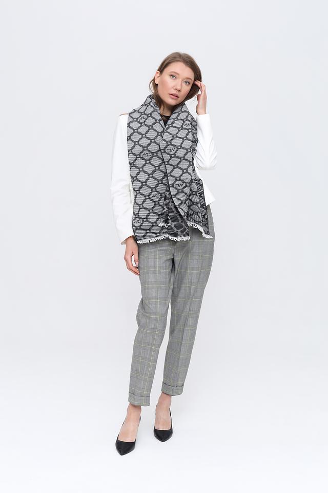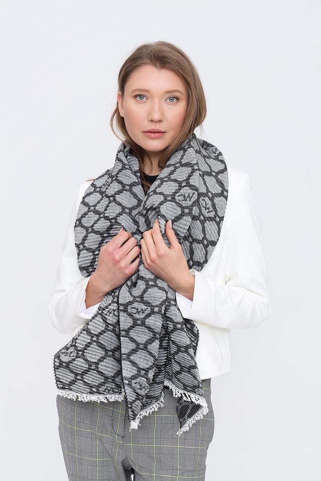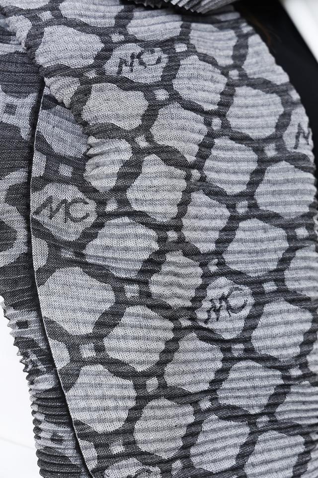 Этот элегантный шарф от Marc Cain выполнен в серой цветовой гамме и украшен повторяющимся логотипом бренда. Шарф имеет прямоугольную форму и выполнен в технике плиссе, что придает ему текстурность и объем.