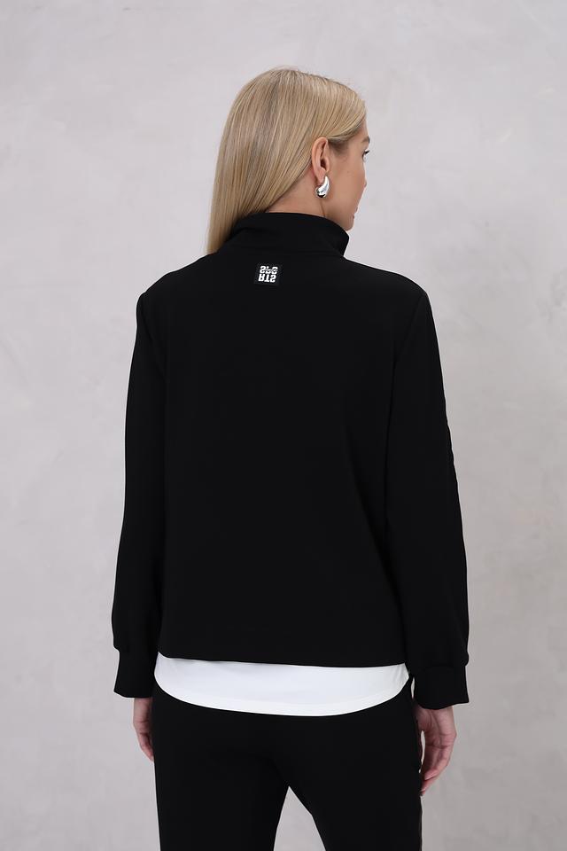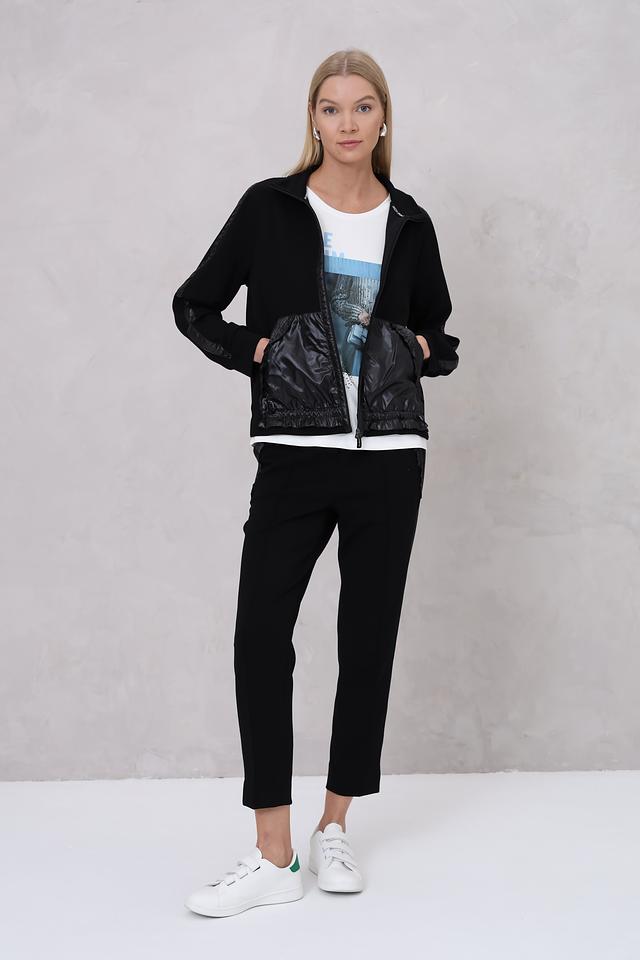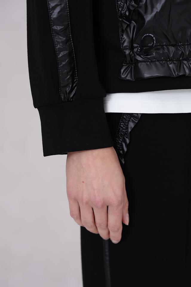 Жакет выполнен в классическом чёрном цвете, который легко сочетается с другими элементами одежды. Основная часть изделия выполнена из плотного трикотажа, обеспечивающего комфорт и свободу движений. Вставки из стеганой ткани придают жакету современный и динамичный вид.