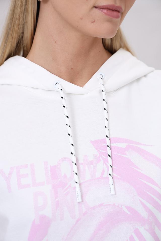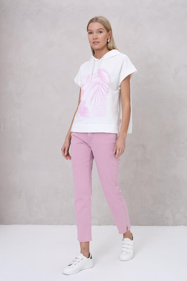 Этот стильный пуловер от Marc Cain выполнен в белом цвете и украшен ярким принтом с изображением пальмовых листьев розового оттенка. Модель имеет свободный крой, короткие рукава и капюшон, что делает ее удобной и практичной для повседневной носки.