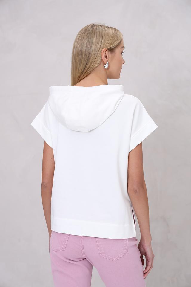 Белый пуловер от Marc Cain с короткими рукавами и принтом в виде пальмовых листьев. Модель с капюшоном и удобным кроем станет отличным дополнением к вашему образу. Состав: хлопок 80%, полиэстер 20%