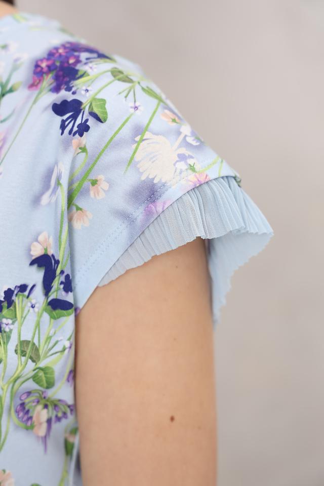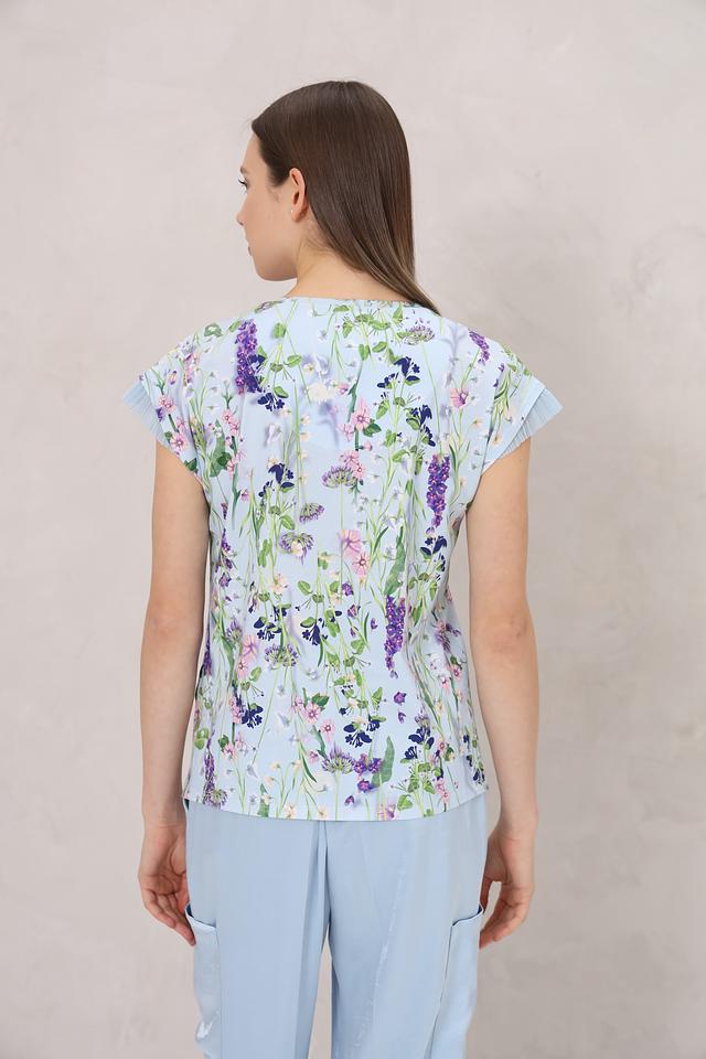 Блуза имеет V-образный вырез горловины и короткие рукава с небольшими воланами, что придаёт ей лёгкость и женственность. Принт расположен по всей поверхности изделия, создавая яркий и запоминающийся образ.