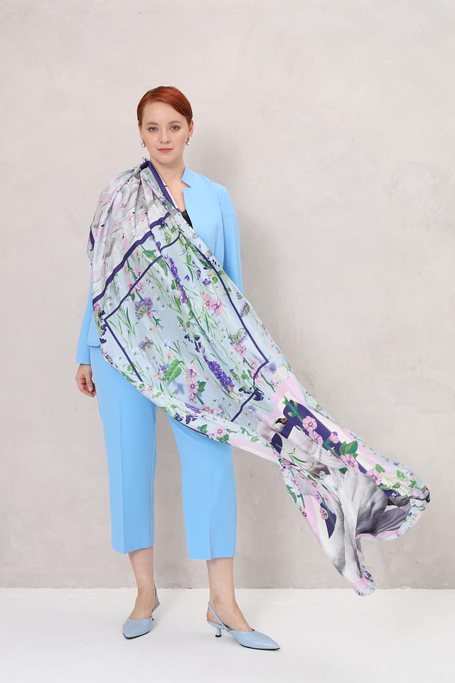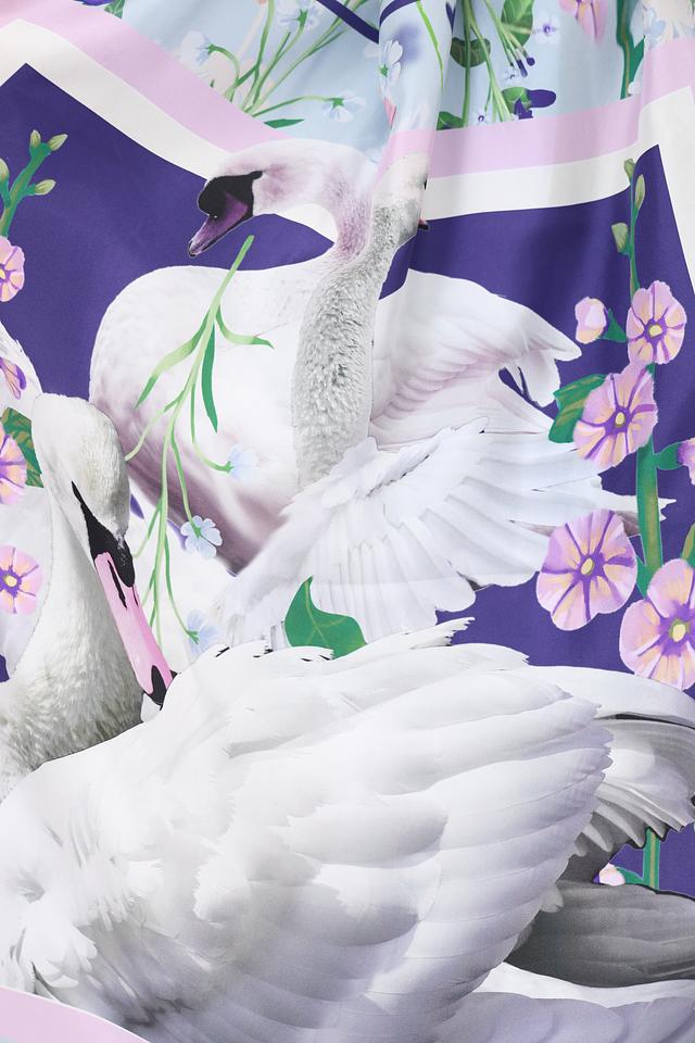 Шарф имеет прямоугольную форму и украшен ярким и запоминающимся принтом с изображением лебедей, дополненным нежными цветочными мотивами. Основной цвет шарфа – светло-голубой, который гармонично сочетается с фиолетовыми, белыми и зелеными оттенками рисунка.
