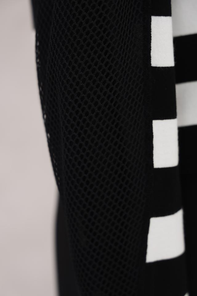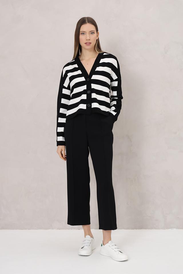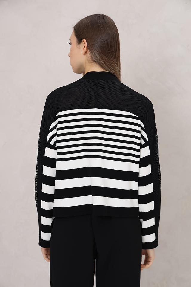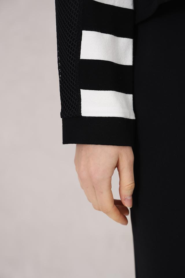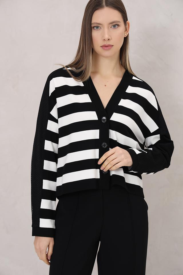 Этот стильный кардиган от Marc Cain станет прекрасным дополнением к вашему гардеробу. Модель выполнена в классическом чёрном цвете с широкими белыми полосами, создающими эффектный контраст.