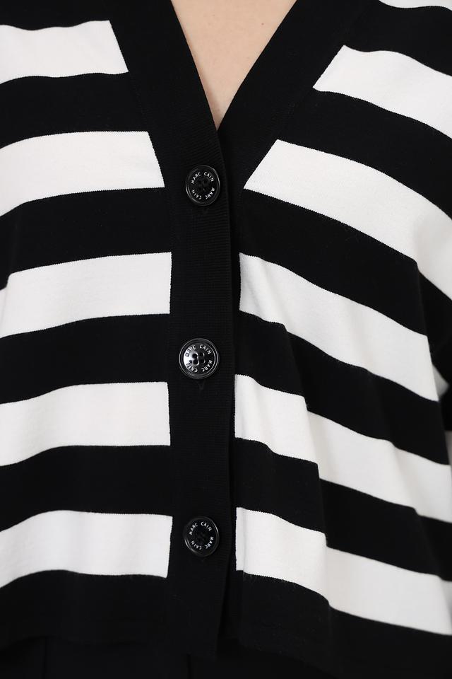 Чёрный кардиган Marc Cain с контрастными белыми полосами. Модель V-образным вырезом и застёжкой на пуговицы, выполнена из мягкого трикотажа с добавлением вискозы и полиэстера. Состав: вискоза 70%, полиэстер 30%
