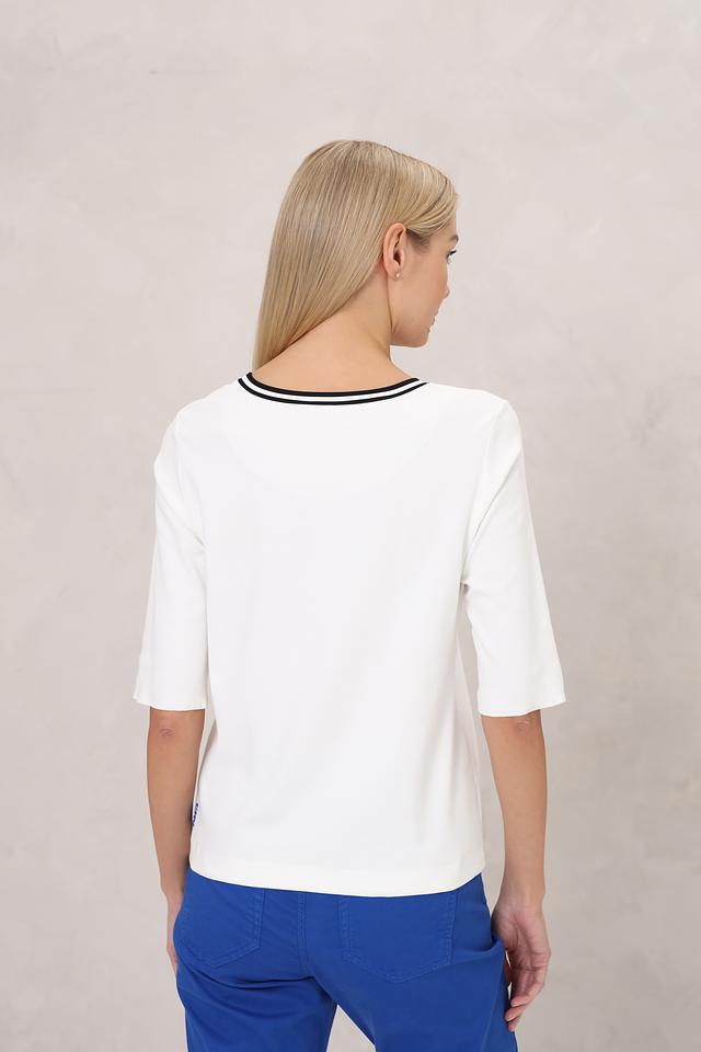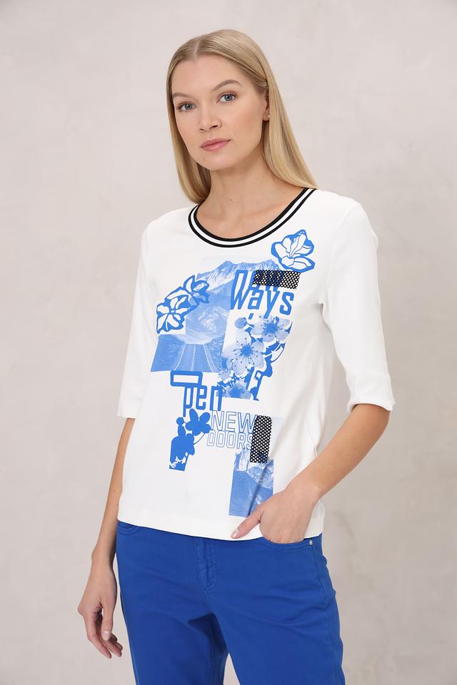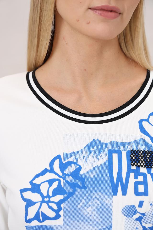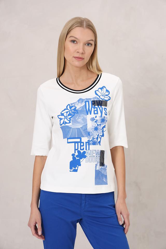 Белая футболка Marc Cain с ярким голубым принтом и чёрной окантовкой. Изготовлена из мягкого хлопка с добавлением эластана для комфорта и свободы движений. Стильный и удобный выбор для повседневного образа. Состав: хлопок 94%, эластан 6%