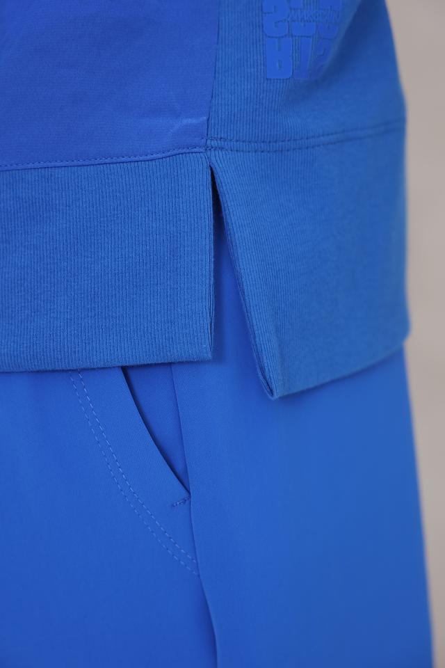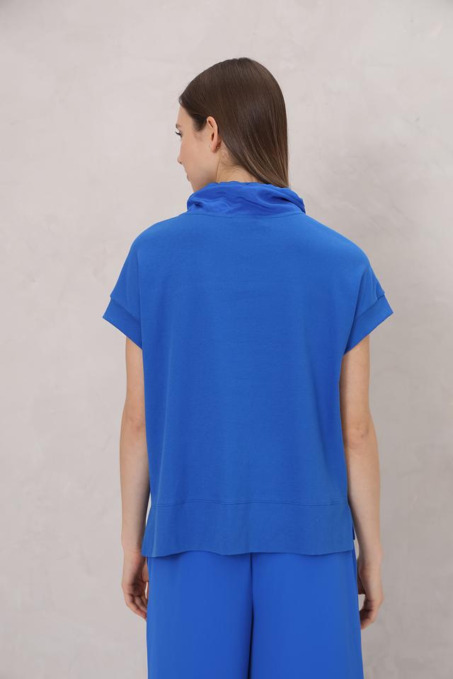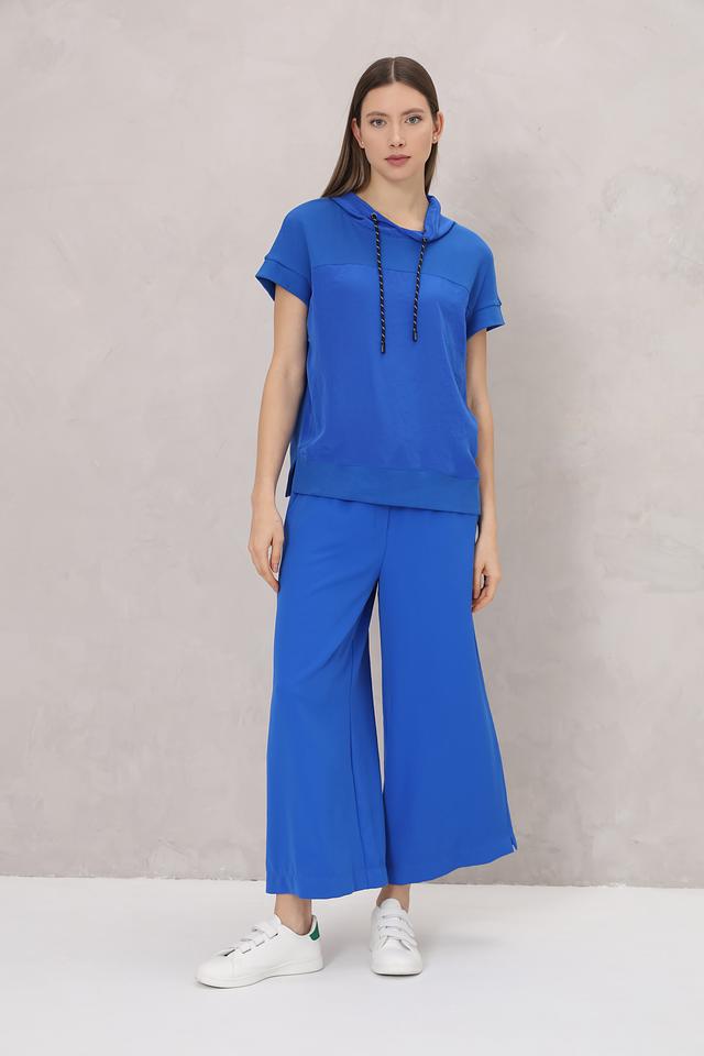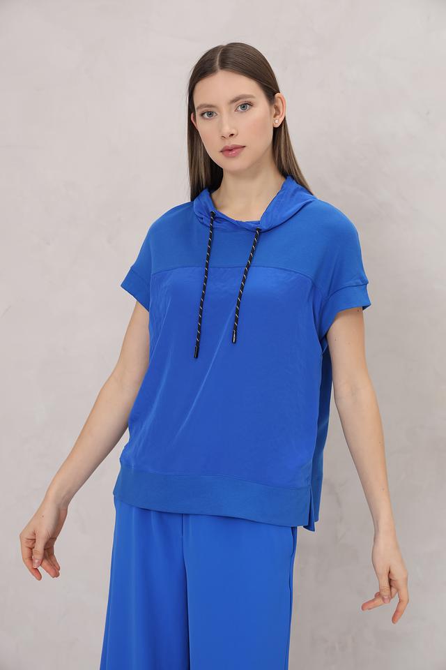 Синяя футболка Marc Cain с короткими рукавами и капюшоном. Изготовлена из мягкого хлопка с добавлением эластана для комфорта и свободы движений. Отличный выбор для повседневного образа. Состав: хлопок 94%, эластан 6%