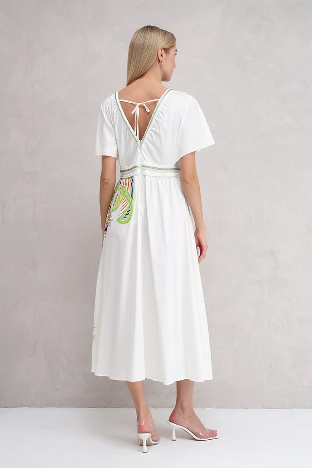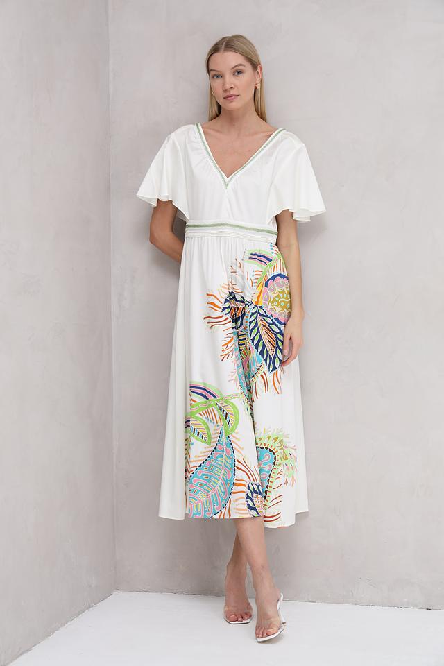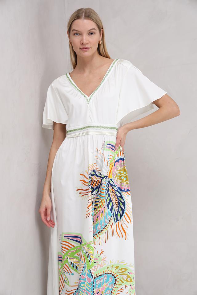 Платье имеет прямой силуэт, короткие рукава-воланы и V-образный вырез. Основной цвет платья – белый, который служит идеальным фоном для яркого и красочного цветочного принта, расположенного на передней части изделия.