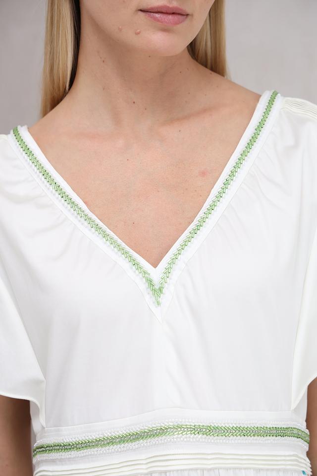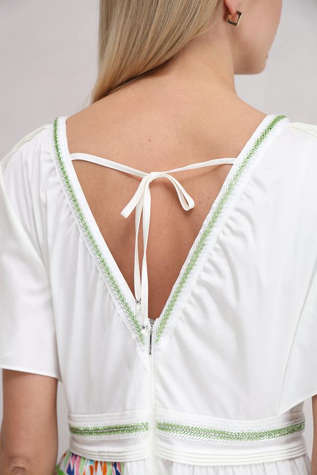 Дополнительным акцентом является деликатная отделка горловины и талии тонкой зеленой тесьмой. Спинка платья украшена небольшим разрезом и завязками. Это платье станет прекрасным выбором для создания легкого и романтичного образа.