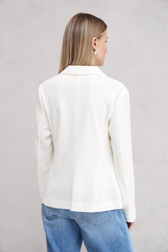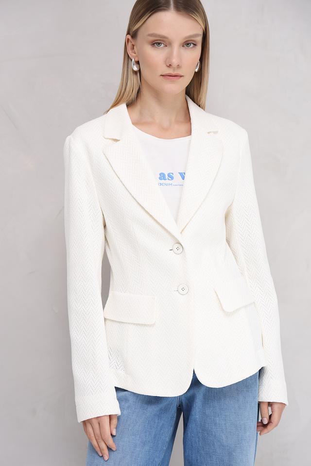 Жакет имеет классический крой с лацканами, длинными рукавами и застежкой на пуговицы. Фактурная ткань придает изделию особый шарм и изысканность.