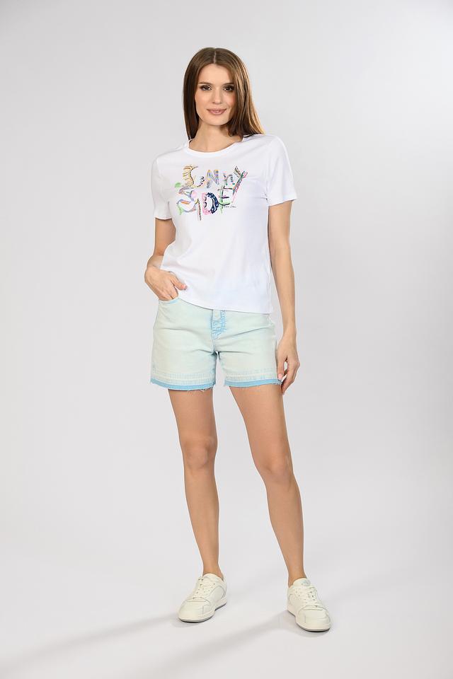 Круглый вырез горловины и короткие рукава обеспечивают классический и универсальный силуэт, который подойдет для различных типов фигур. Футболка идеально сочетается с джинсами, шортами или юбками, создавая непринужденный и стильный образ.