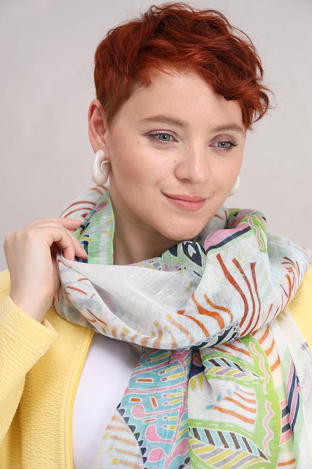 Шарф изготовлен из премиальных материалов: 50% модал, 42% лен и 8% шелк. Такое сочетание обеспечивает изделию мягкость, приятные тактильные ощущения и легкий вес. Шарф отлично драпируется и не вызывает дискомфорта при ношении.