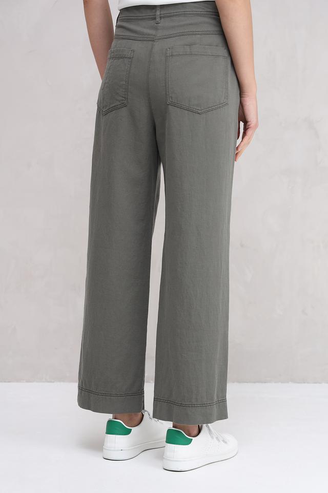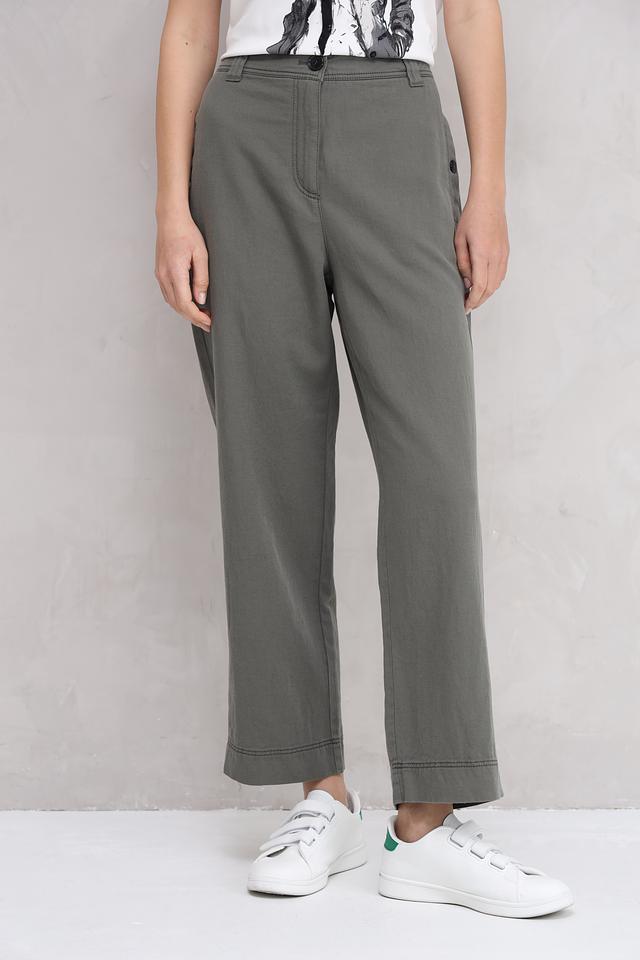 Состав ткани включает хлопок, лен, лиоцел и небольшое количество эластана, благодаря чему брюки приятны к телу, хорошо держат форму и не сковывают движений. Два боковых кармана и два задних кармана с клапанами добавляют функциональности.