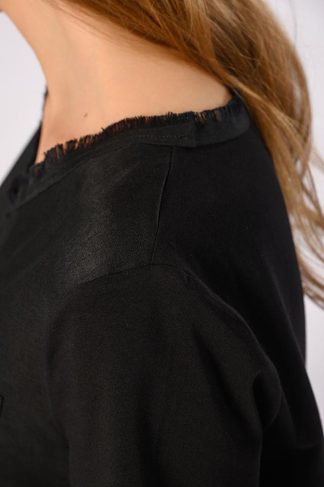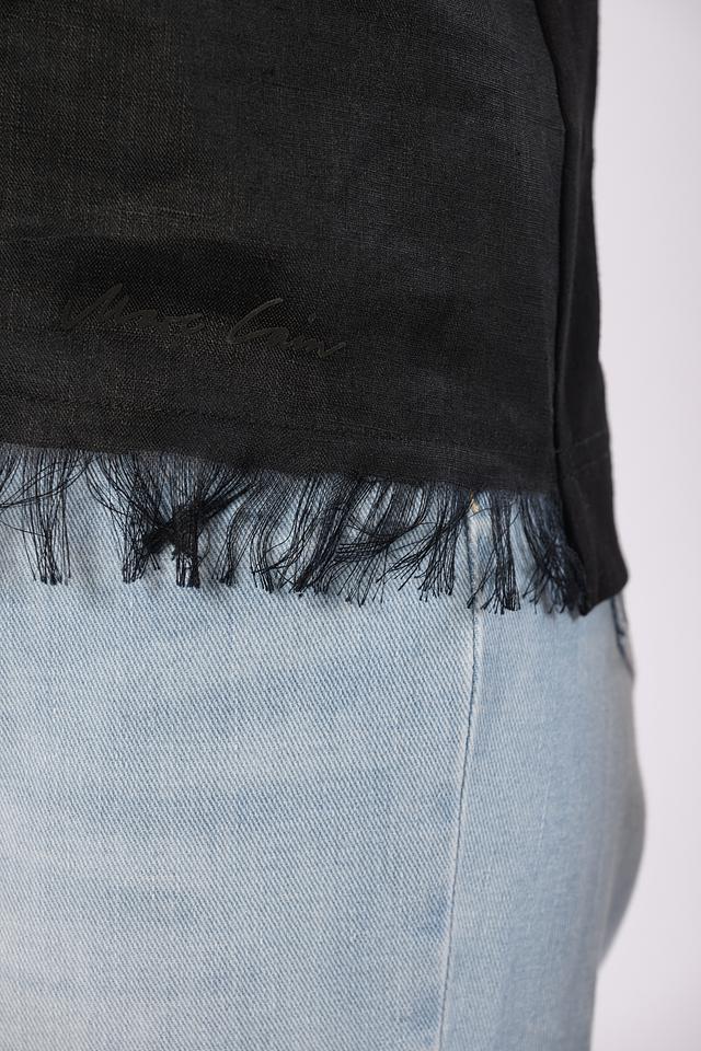 Чёрная блуза Marc Cain из хлопка с эластаном, украшенная бахромой по краю. Модель имеет V-образный вырез и короткие рукава, что делает её идеальным выбором для создания стильного и комфортного образа. Состав: хлопок 95%, эластан 5%