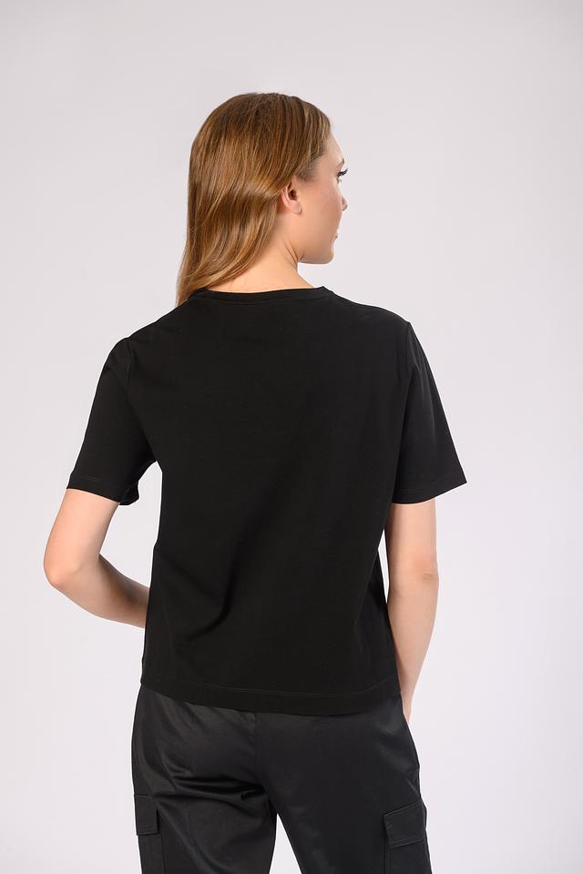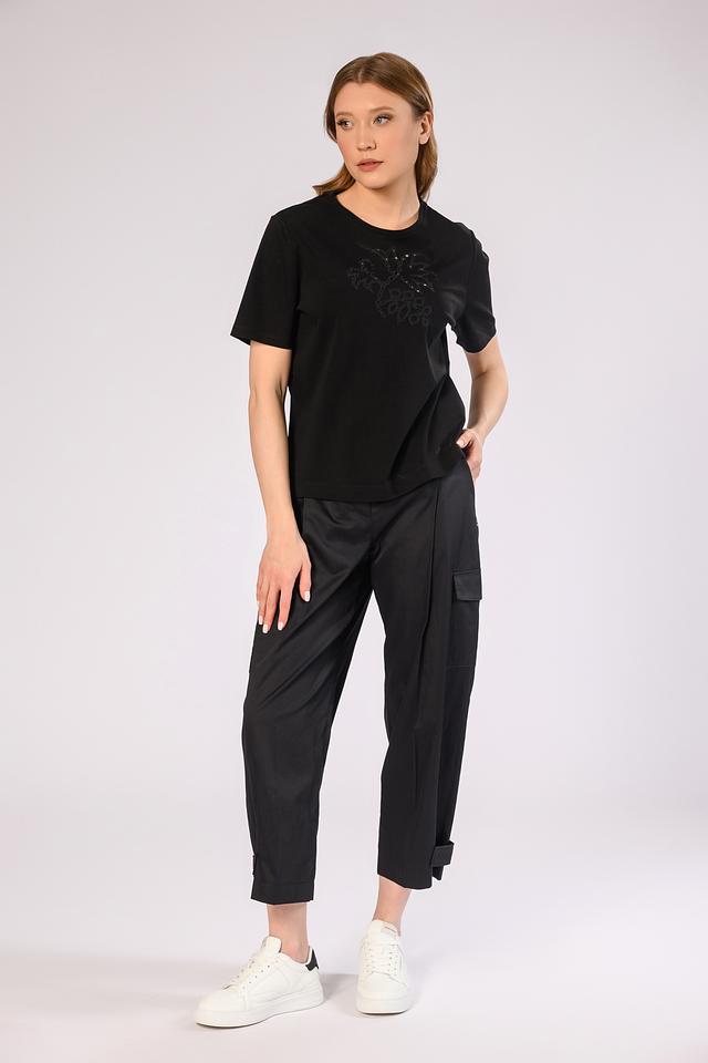 Чёрная футболка Marc Cain из 100% хлопка, украшенная оригинальным декором в виде цветочного орнамента. Стильная и комфортная модель для создания повседневных образов. Состав: хлопок 100%