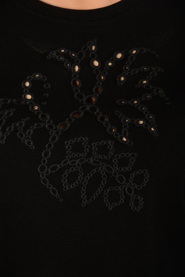 Основной цвет футболки – чёрный, что делает её универсальной основой для различных образов. Главная особенность модели – декоративная отделка в области горловины, выполненная в виде цветочного орнамента с использованием различных текстур и элементов.