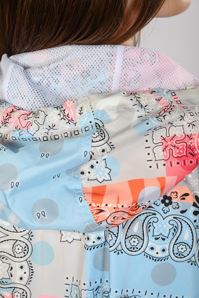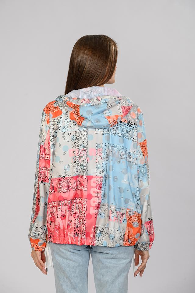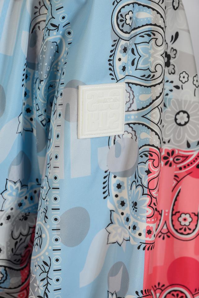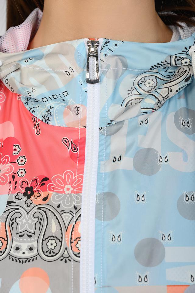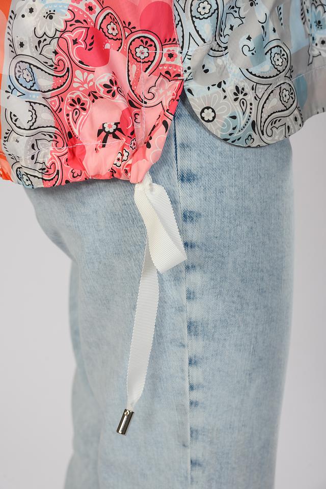 Особенностью модели является яркий и красочный принт пейсли, сочетающий в себе оттенки розового, голубого и оранжевого. Куртка имеет удобный капюшон и застегивается на молнию. По бокам куртки предусмотрены шнурки для регулировки силуэта.