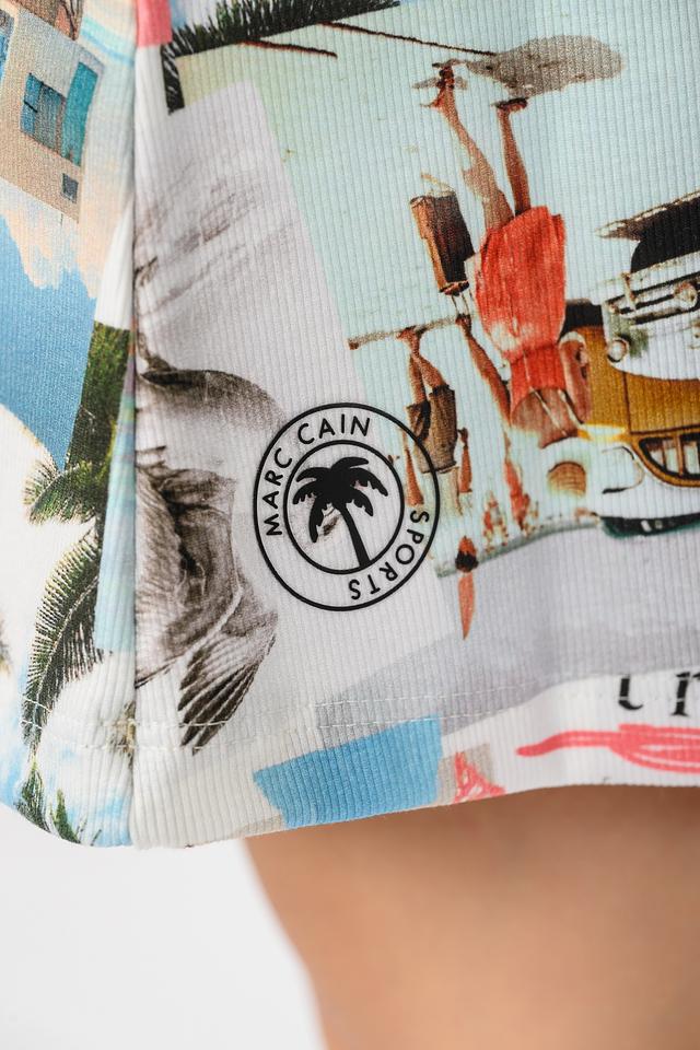 Платье Marc Cain Sports с ярким разноцветным принтом в виде коллажа из морских пейзажей и архитектурных элементов. Модель выполнена из мягкого хлопка с добавлением эластана, обеспечивающего комфортную посадку. Состав: хлопок 94%, эластан 6%