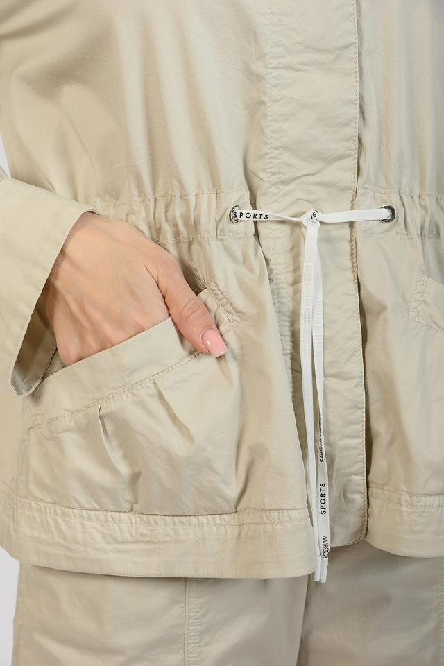 Жакет выполнен в нежном бежевом цвете, который легко сочетается с различными элементами гардероба. Логотип бренда Sports нанесен на шнурки кулиски.