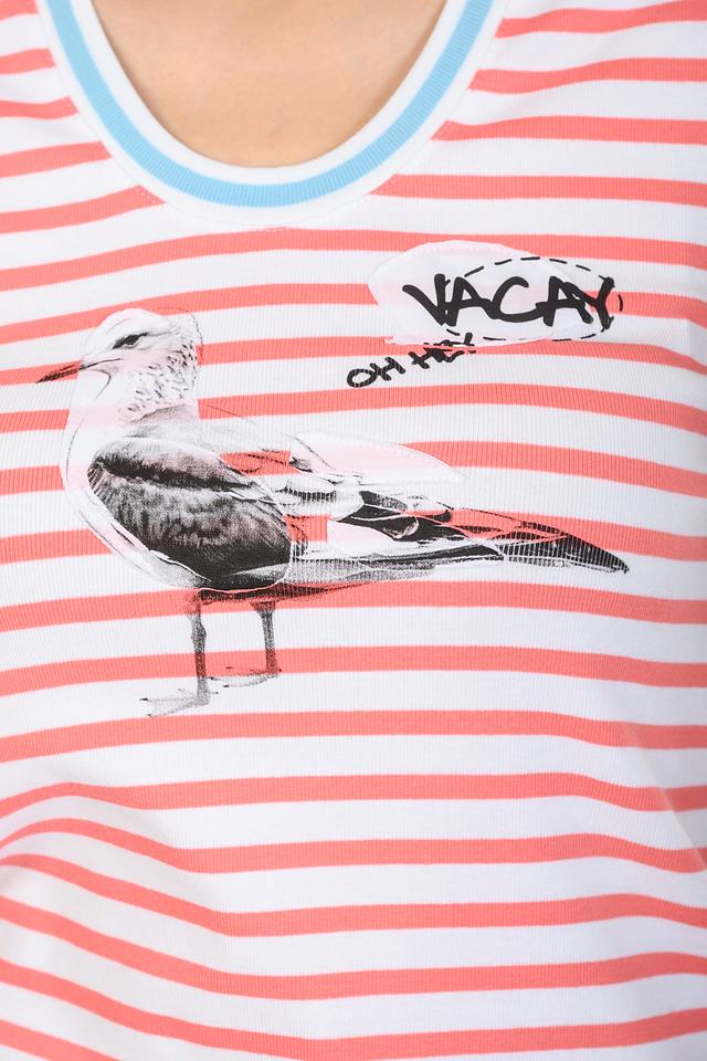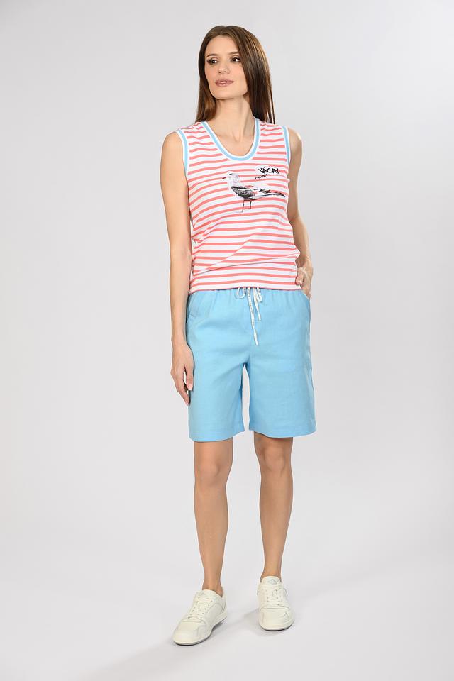 Особый акцент топа – оригинальный принт с изображением птицы и надписью “VACAY OH HEY”. Вырез горловины и проймы выполнены в светлой голубой окантовке, что добавляет контрастности и завершенности образу.