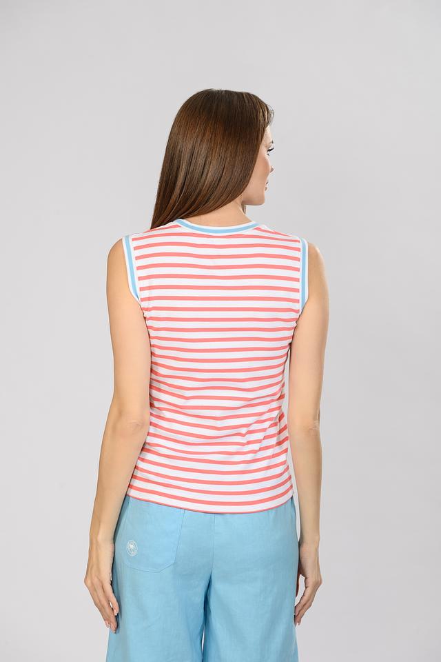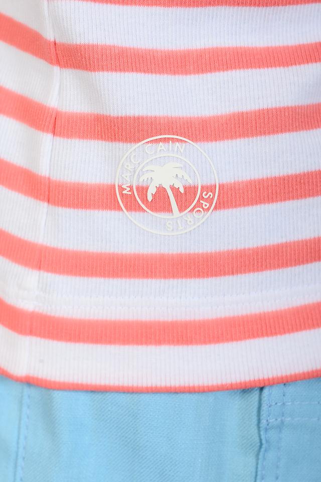 Розовый топ Marc Cain в полоску с ярким принтом — стильное и комфортное решение для летнего гардероба. Модель выполнена из мягкого хлопка с добавлением эластана, обеспечивающего удобную посадку. Состав: хлопок 94%, эластан 6%