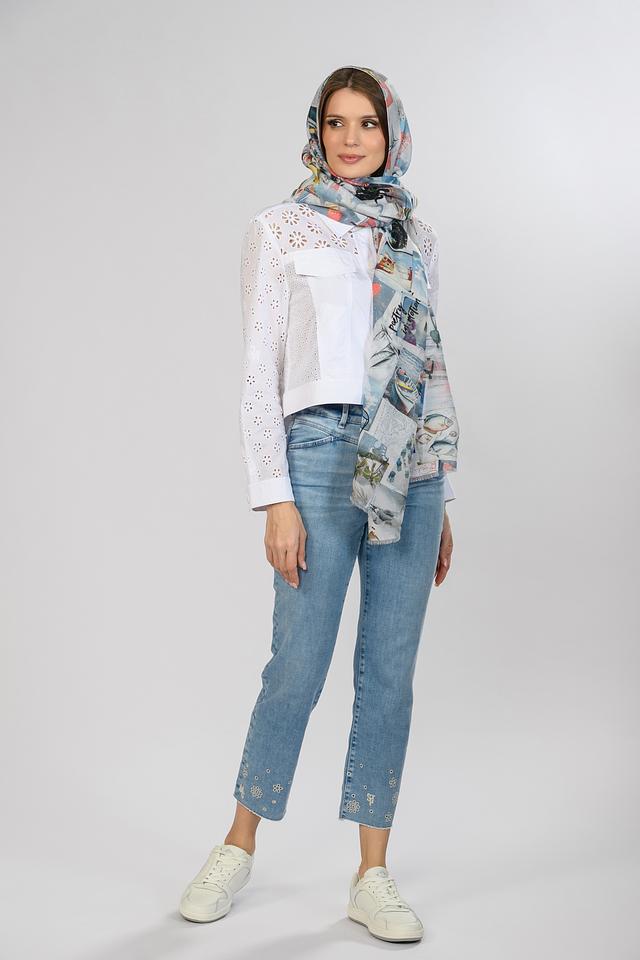 Этот шарф от Marc Cain – идеальный аксессуар для создания яркого и запоминающегося образа. Шарф выполнен в светло-голубой цветовой гамме и украшен оригинальным принтом с изображением городских пейзажей, зданий и архитектурных элементов.