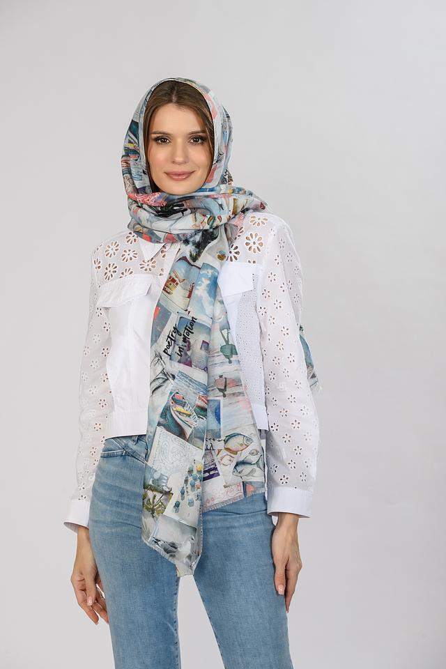 Шарф Marc Cain светло-голубого цвета с ярким принтом в виде городских пейзажей станет стильным дополнением к вашему образу. Изготовлен из высококачественного хлопка и шелка, обеспечивая мягкость и комфорт. Состав: хлопок 72%, шелк 28%