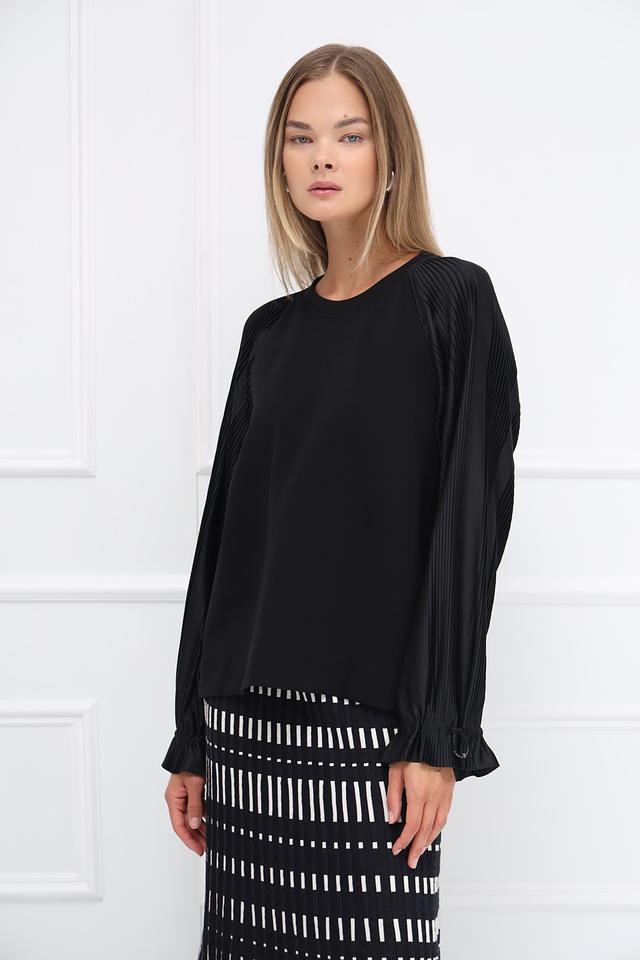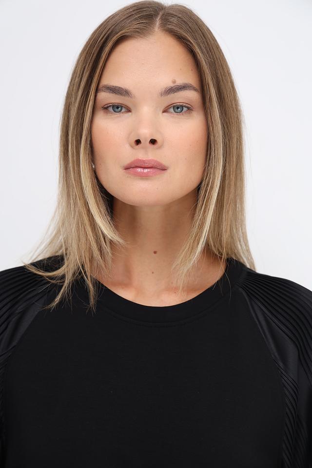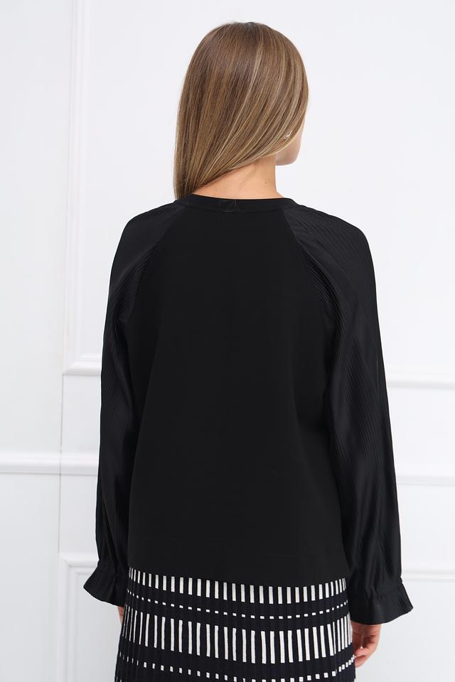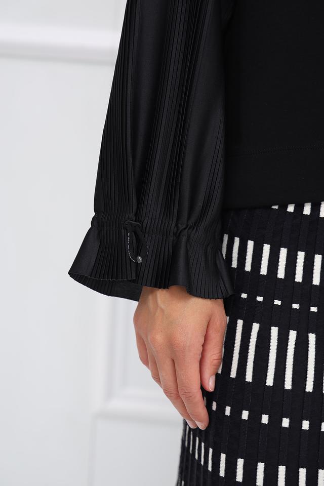 Черная блуза Marc Cain с рукавами-фонариками и плиссированными вставками. Модель выполнена из мягкого хлопка с добавлением полиэстера и эластана, обеспечивающих комфорт и сохранение формы. Состав: хлопок 88%, полиэстер 8%, эластан 4%