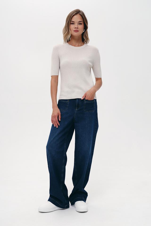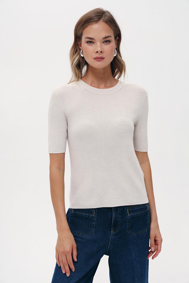 Пуловер имеет классический крой с круглым вырезом горловины и короткими рукавами. Текстура вязки придает изделию особую привлекательность. Бежевый цвет делает его универсальным и легко сочетаемым с различными элементами одежды.