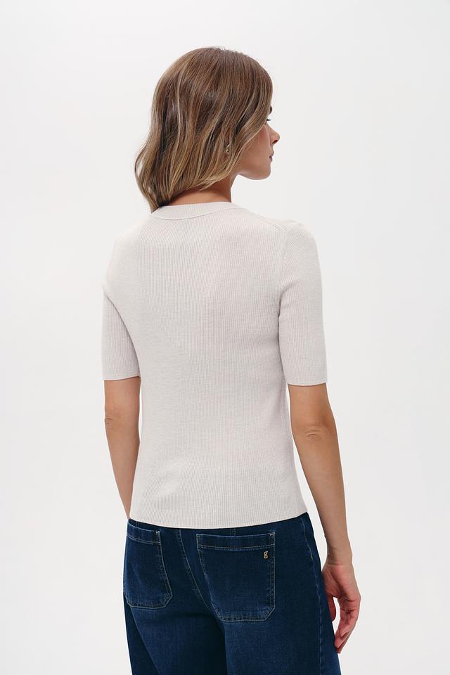 Бежевый пуловер Marc Cain из шерсти с добавлением металлизированной нити. Модель имеет круглый вырез и короткий рукав. Идеальный выбор для создания элегантного и комфортного образа. Состав: шерсть 85%, метализ.нить 15%
