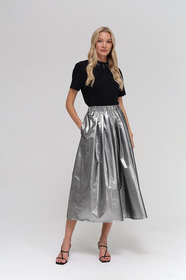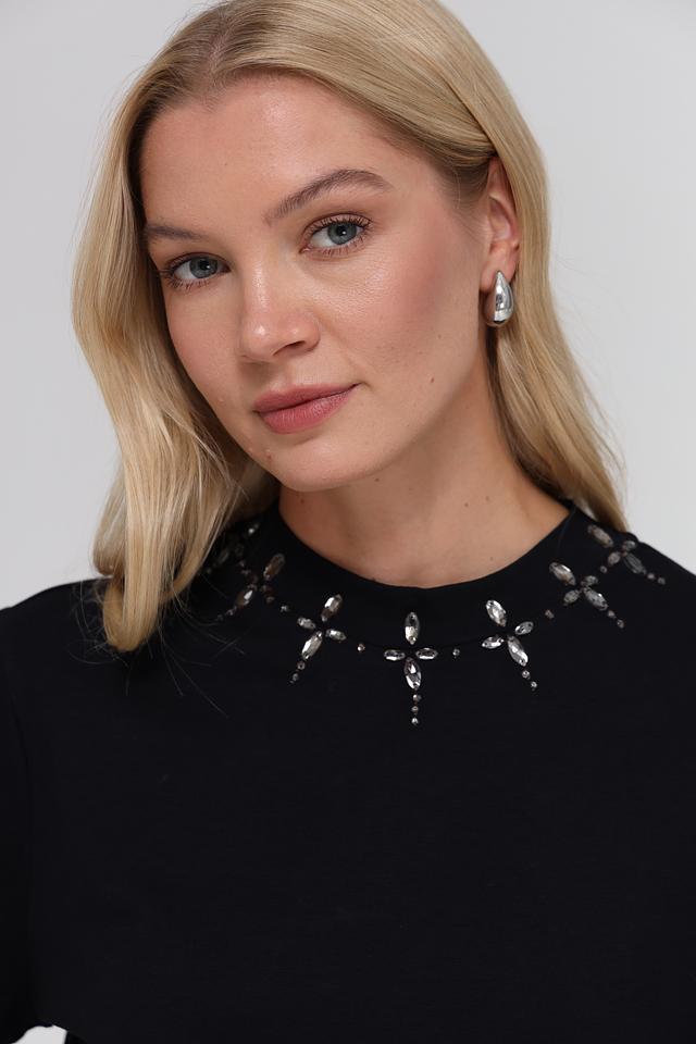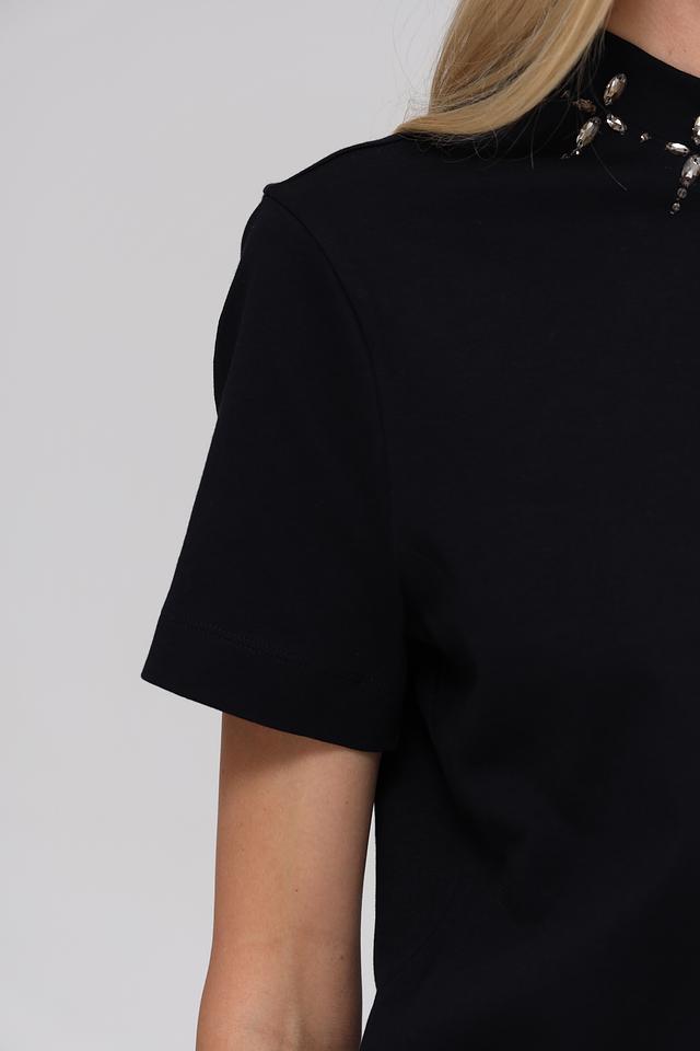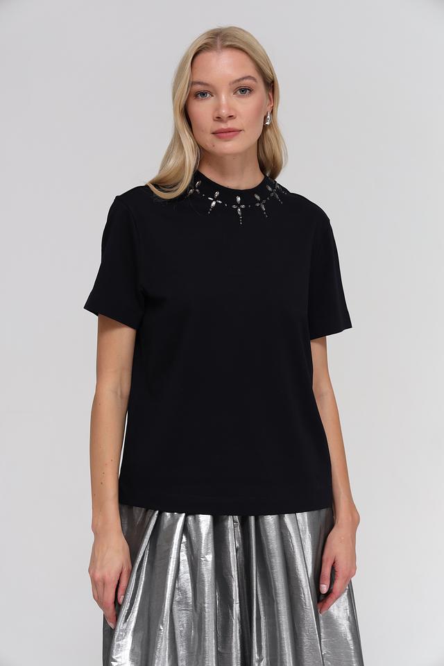 Особенностью данной модели является декор в виде кристаллов, расположенных вокруг горловины, что придает ей изысканность и привлекательность. Футболка имеет прямой крой и короткие рукава, обеспечивающие свободу движений.