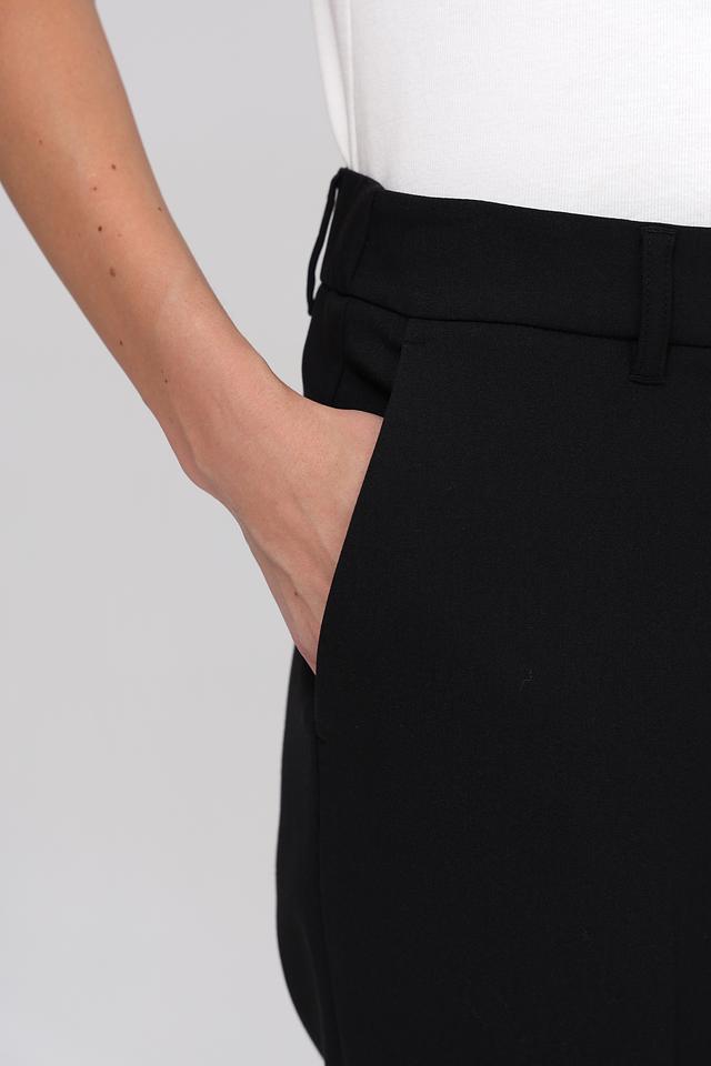 Брюки имеют прямой крой, стандартную посадку по талии и застёжку на молнию и пуговицу. Особенности дизайна включают аккуратные складки спереди, которые придают брюкам более формальный вид. На задних половинках брюк расположены функциональные карманы с клапанами.