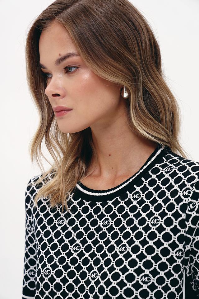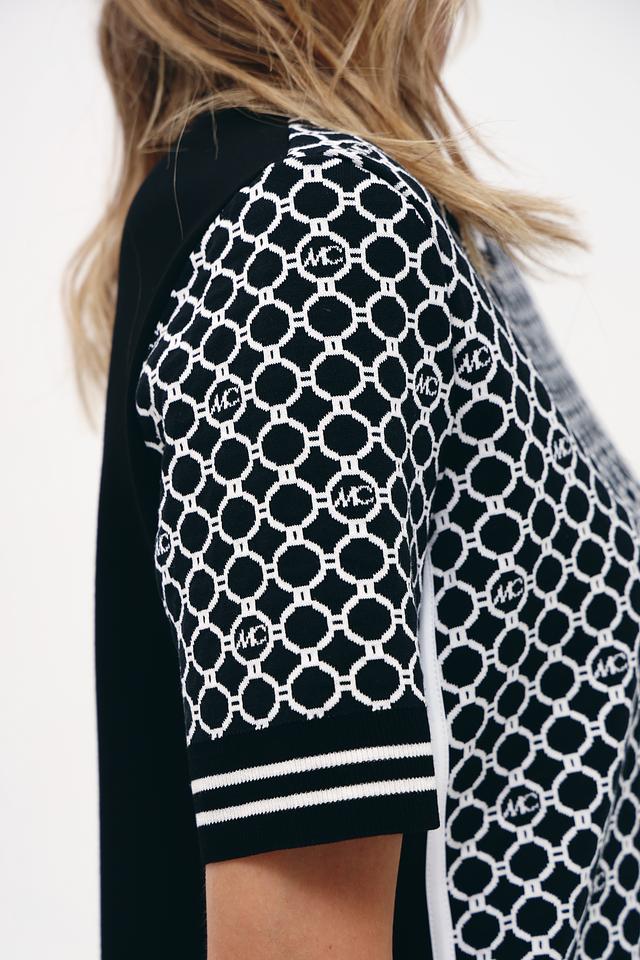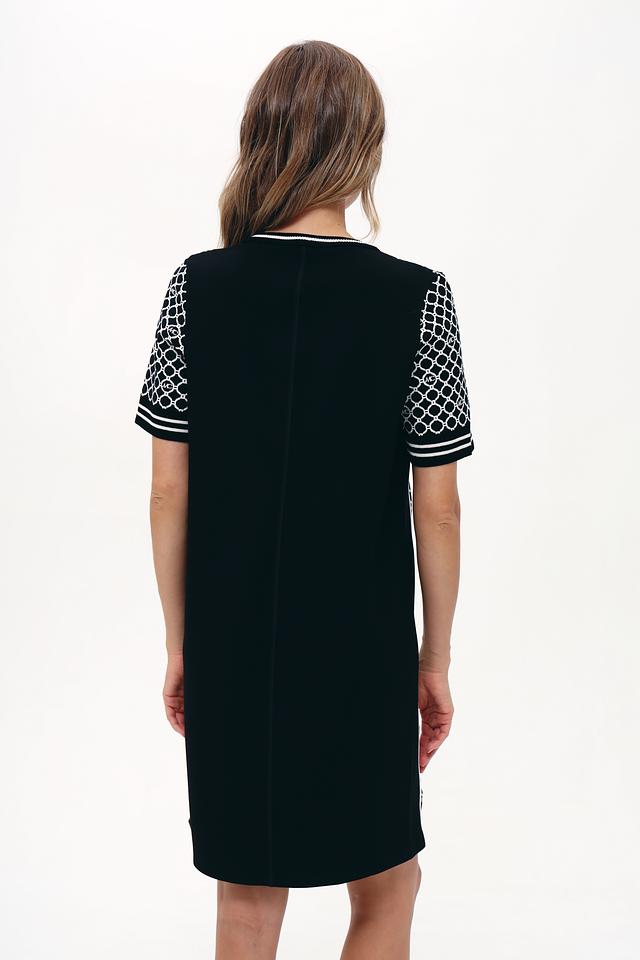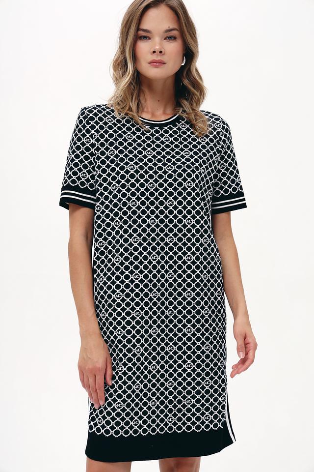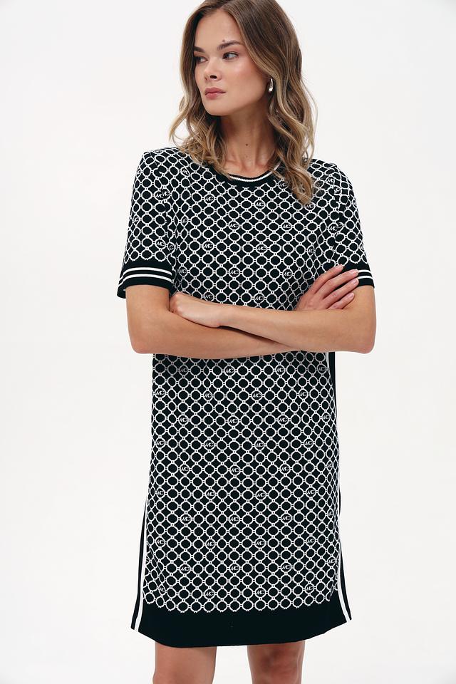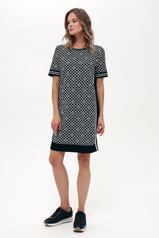 Основной цвет платья – чёрный, украшенный контрастным геометрическим принтом в белых тонах. Принт состоит из повторяющихся логотипов бренда, что придает изделию узнаваемый и стильный вид. Короткие рукава и прямой силуэт делают платье удобным для повседневной носки.